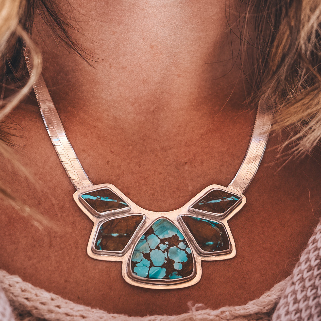 This bold necklace makes a statement! This stunner features Hubei Turquoise paired with Royston Turquoise on a herringbone chain.