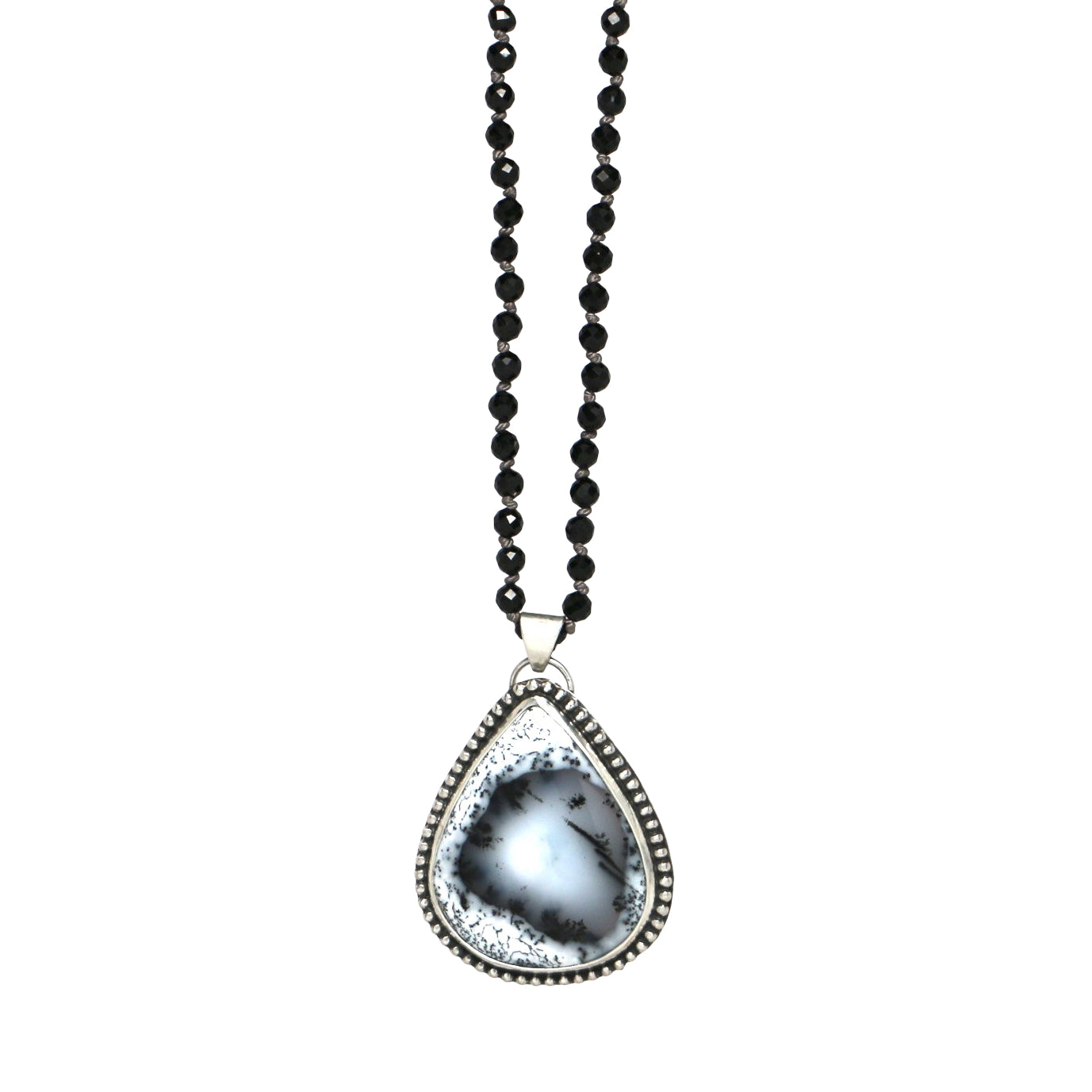 This necklace features a stunning Dendritic Agate pendant suspended on a long 33" chain. The stone is milky white with spindles of black and pockets of translucent gray. This piece is hand crafted from sterling silver and fine silver, and can be worn either long or short.