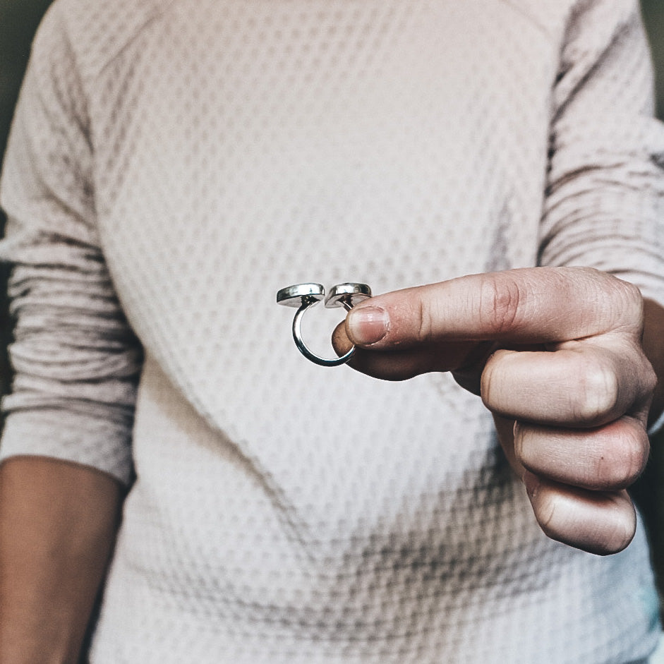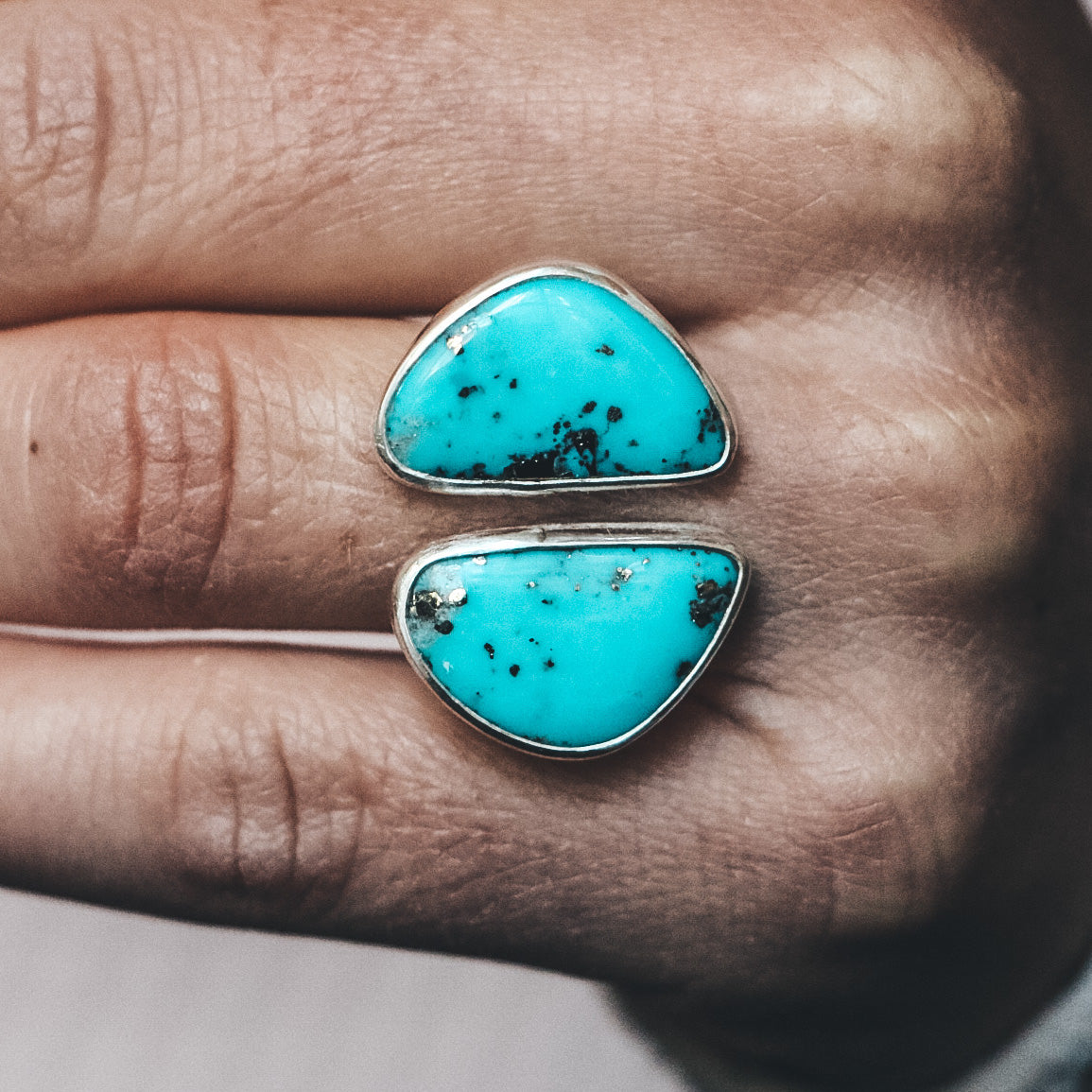 This double stone ring features two Kingman Turquoise stones set on an open band. Kingman Turquoise, mined in Arizona, is deep teal in color with natural glittering pyrite flecks. Each part of this ring is hand fabricated from sterling silver and fine silver.