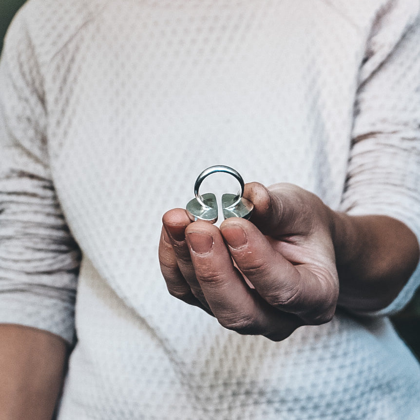 This ring is an open band style, and can be slightly pinched closed or adjusted open to fit sizes 6.5-7.5. It is not recommended that the band is opened and closed repeatedly, as this will weaken the metal over time and can cause the band to break.