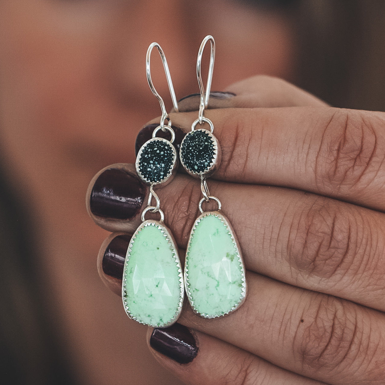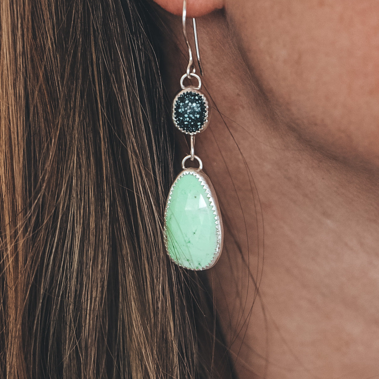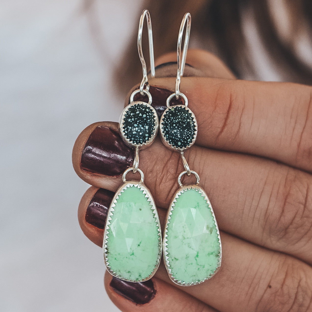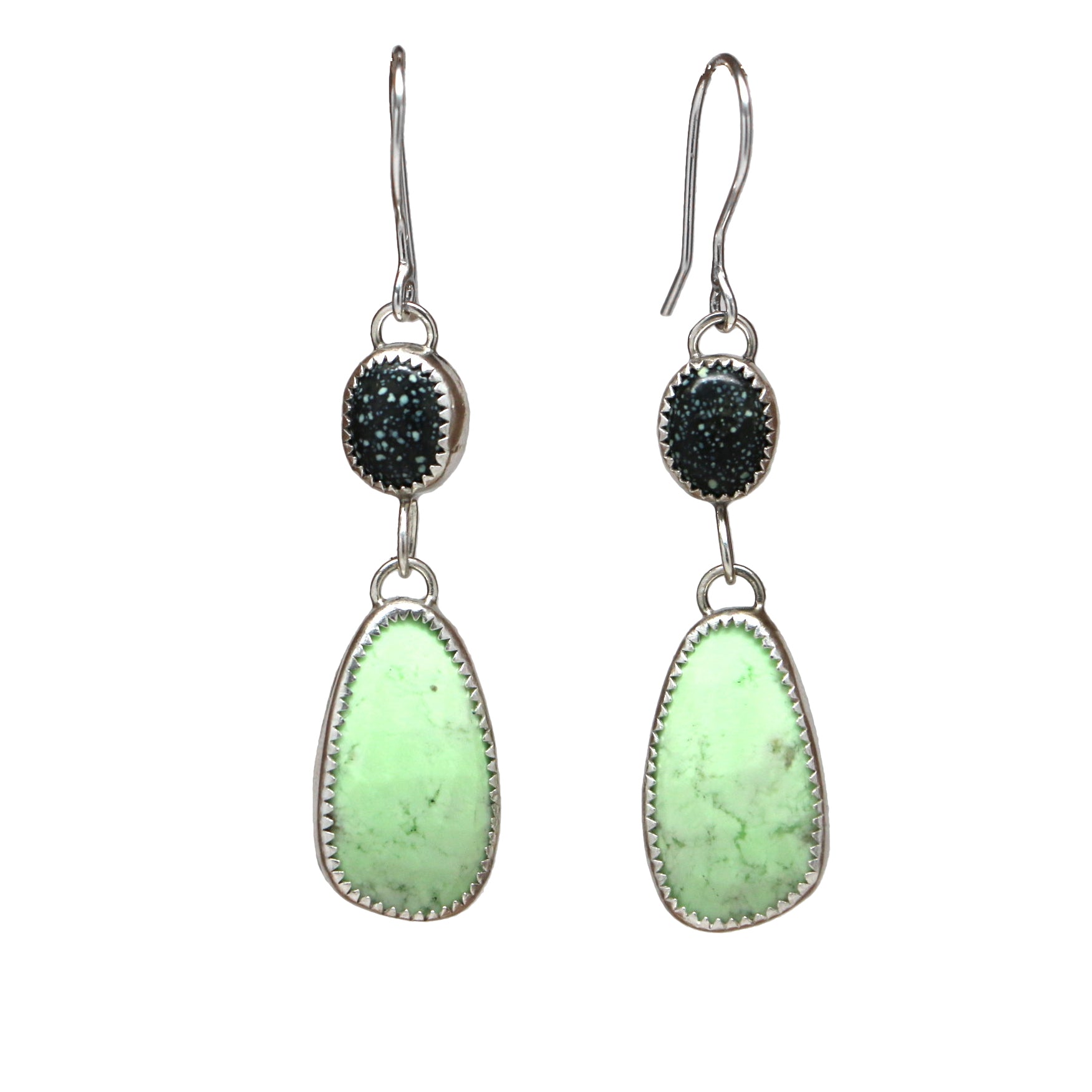 These double stone drop earrings feature New Lander Turquoise on the top with faceted chrysoprase stones on the bottom.*