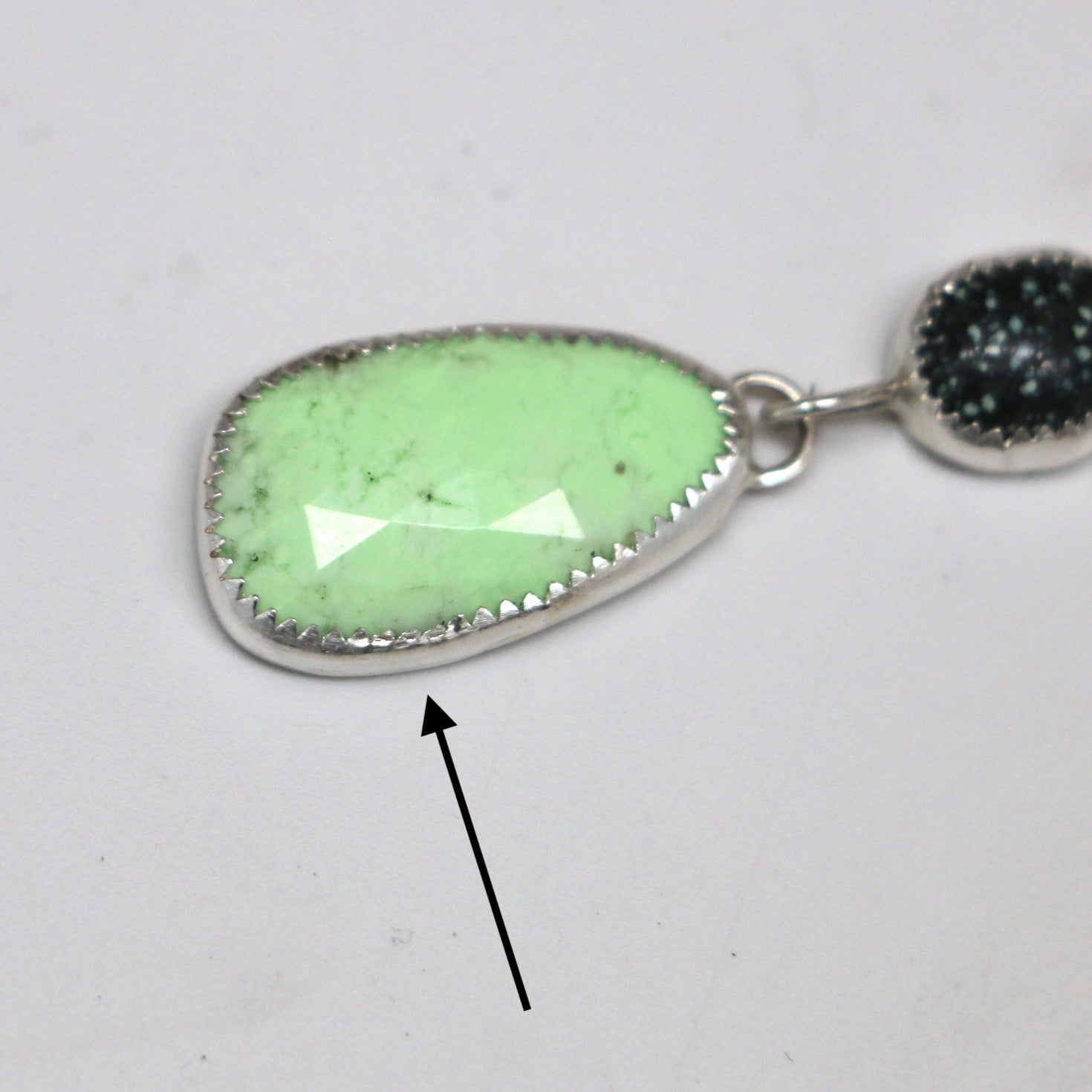 * the bezel on one earring suffered some slight damage during stone setting (see last image with arrow) Due to the slight damage on a few of the serrated teeth of the bezel, these earrings have been discounted accordingly (10% discount from the original price of $178)