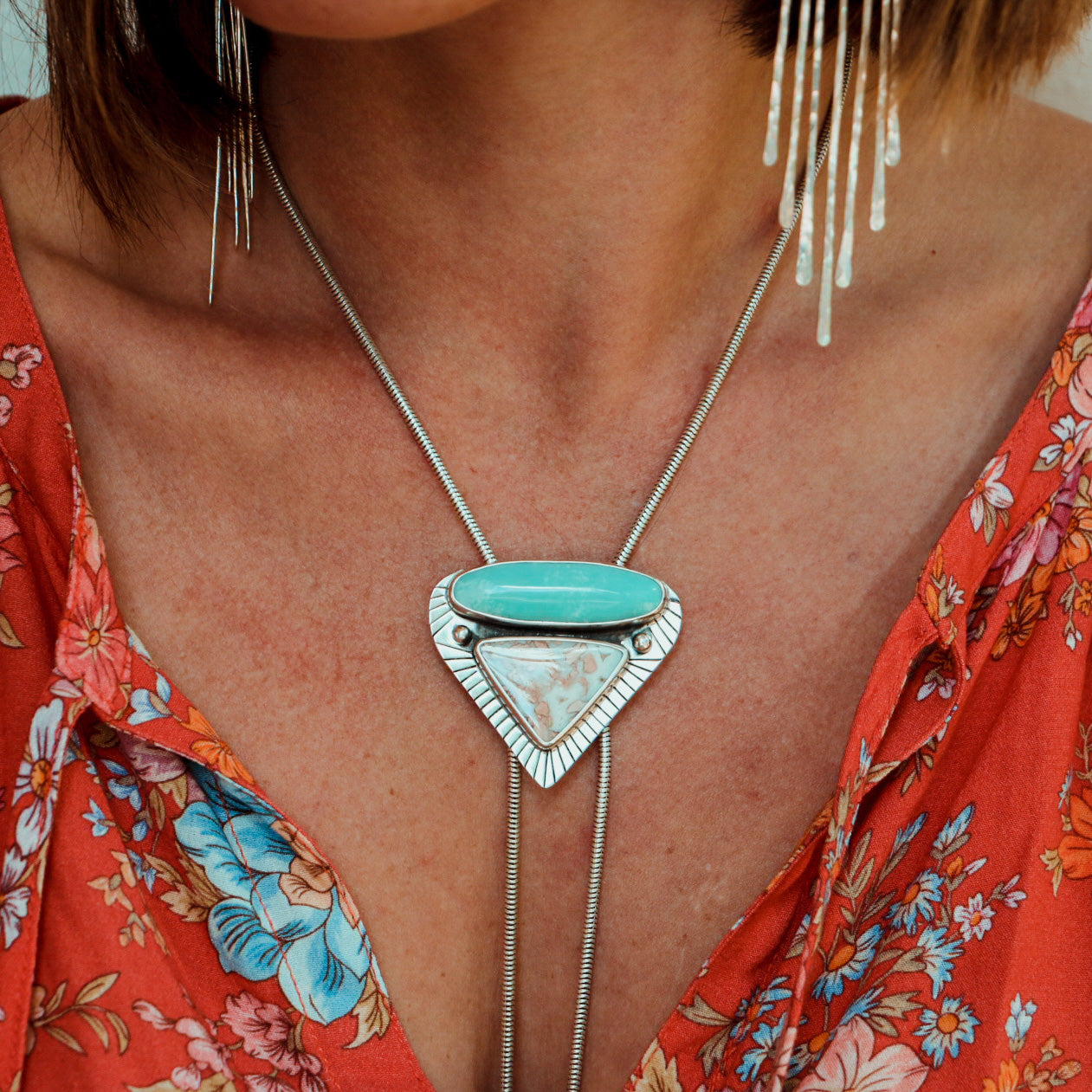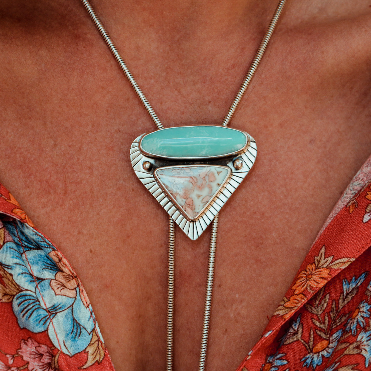 This chain bolo tie features two paired stones: a stunning Campitos Turquoiseand a cotton candy agate. The stones are framed in fine silver and sterling silver, and the bolo has a handmade slide on the backside.