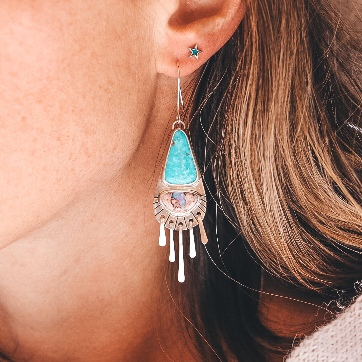 This pair of Fringies features Kingman Turquoise and Mexican Opals, which are set in sterling silver and fine silver with handmade fringe. Earrings are lightweight and measure 3" in length.