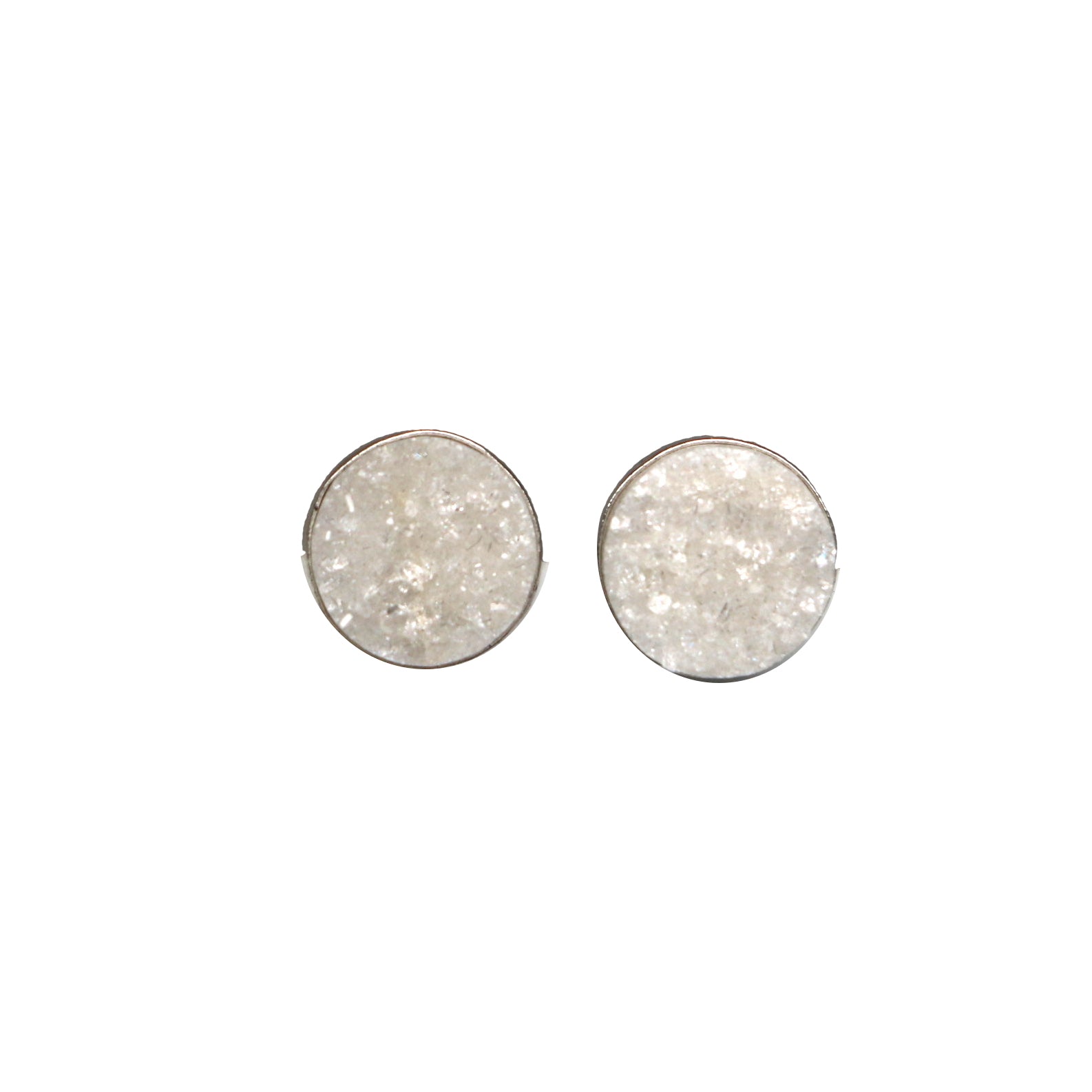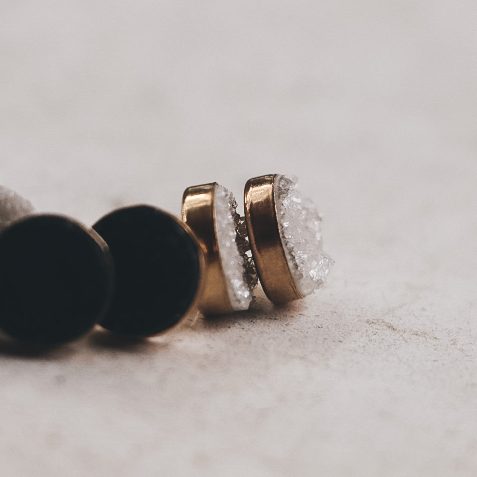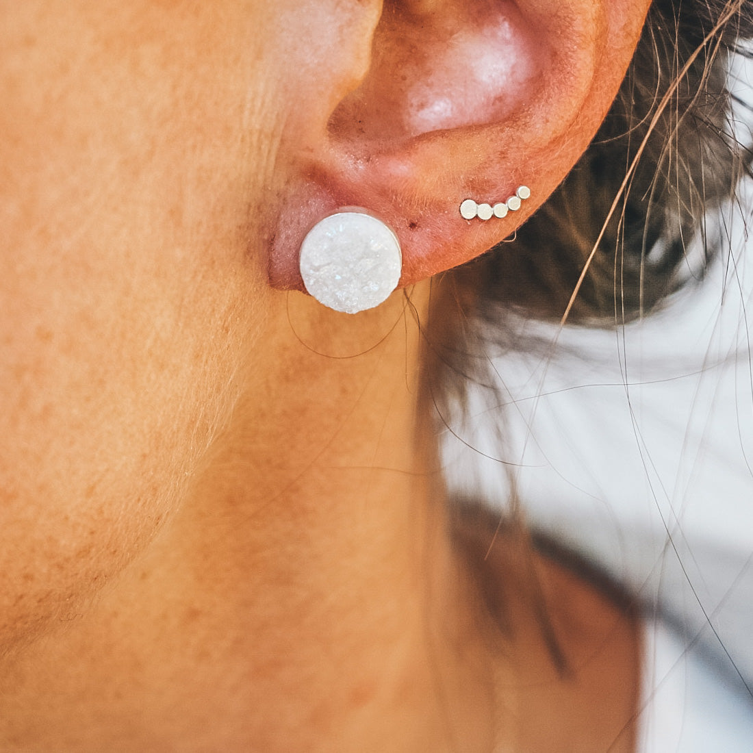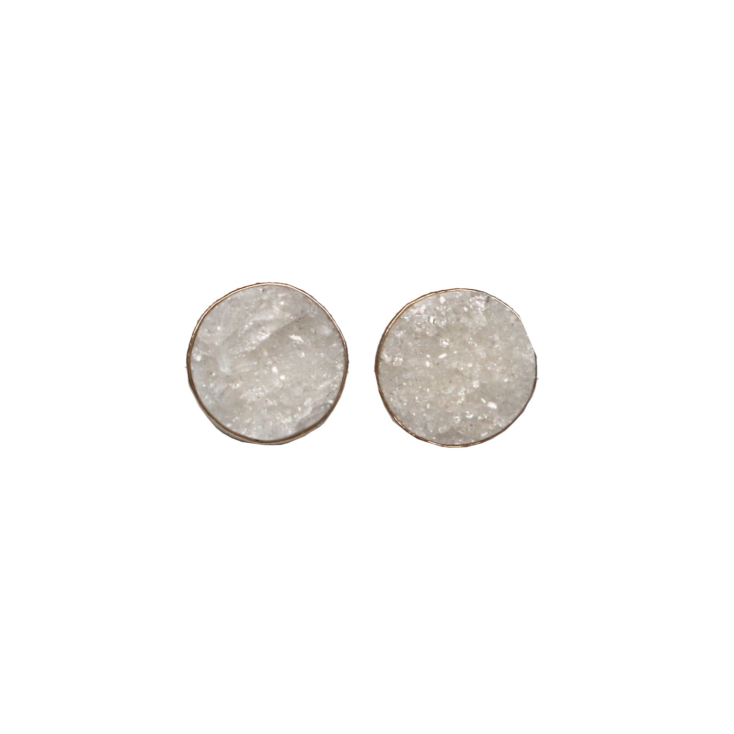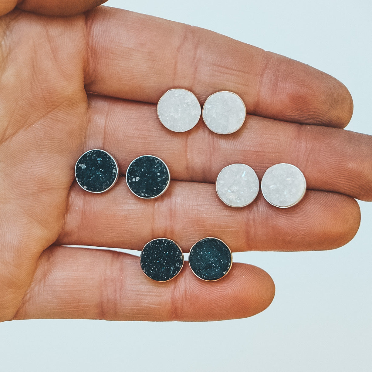 These simple studs feature natural white druzy in sterling silver or 14k gold fill. Each pair of natural stones are hand-matched, and vary slightly in texture.