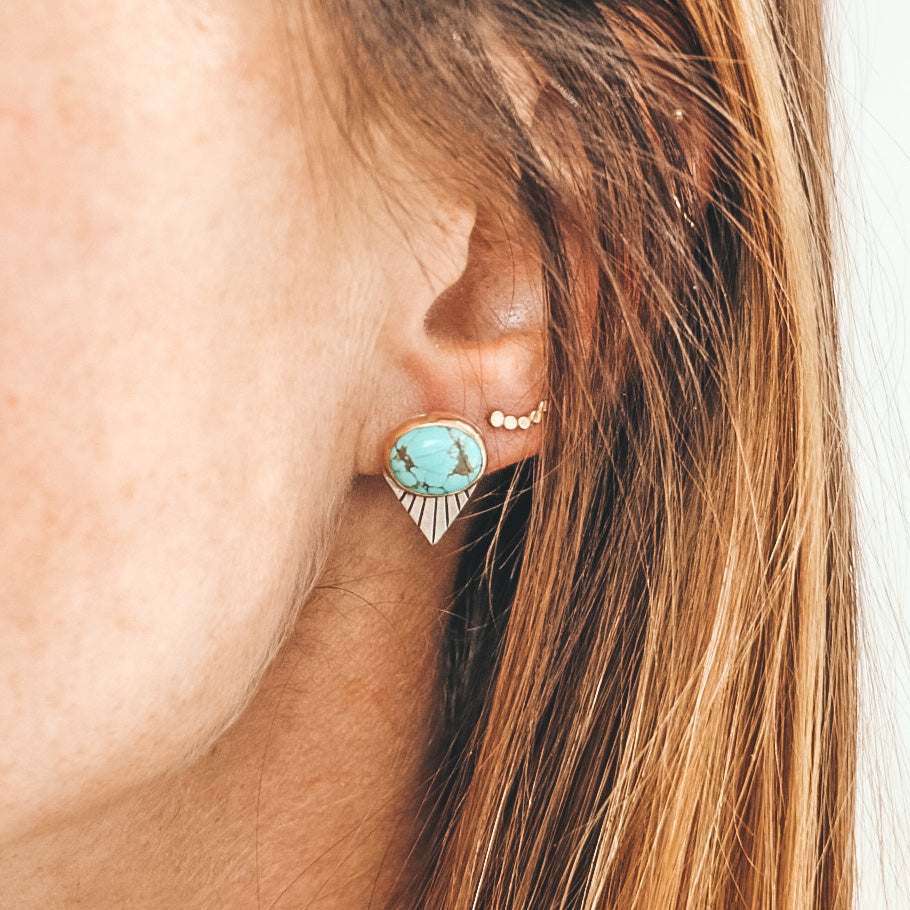 These petite fan studs feature Carico Lake Turquoise, mined in Nevada. The stones are set in sterling silver with a 14k gold filled bezel, and are embellished with a precise fan pattern.