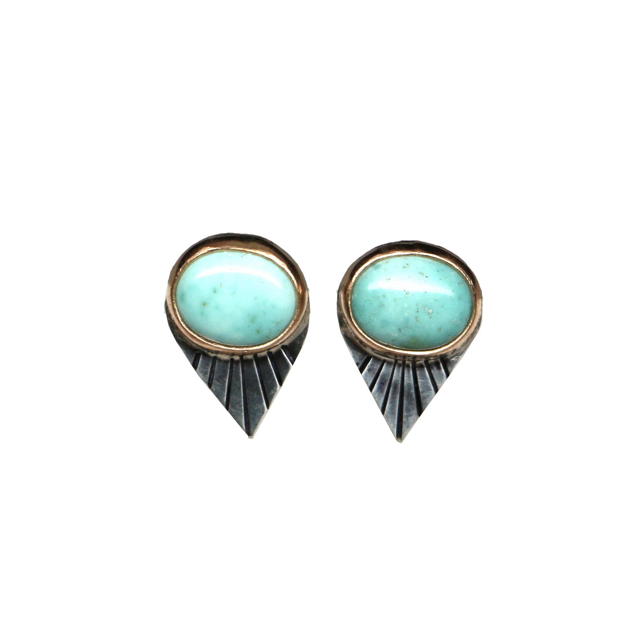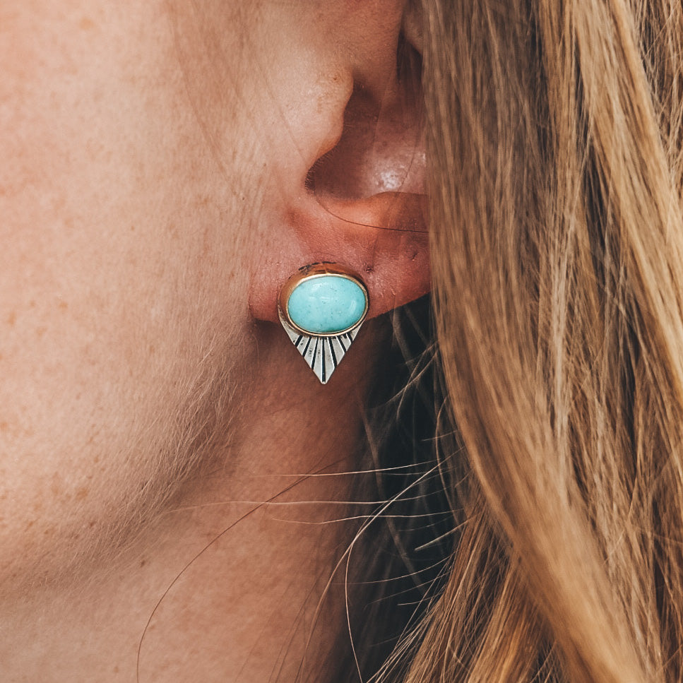 These petite fan studs feature Carico Lake Turquoise, mined in Nevada. The stones are set in sterling silver with a 14k gold filled bezel, and are embellished with a precise fan pattern.
