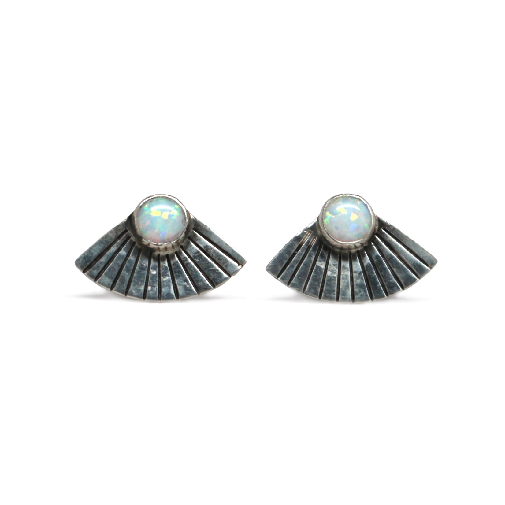This pair features sparkling white synthetic opals; synthetic or lab-grown opals have the exact same structural makeup as opals found in nature, but are stronger and less likely to crack when set into jewelry.