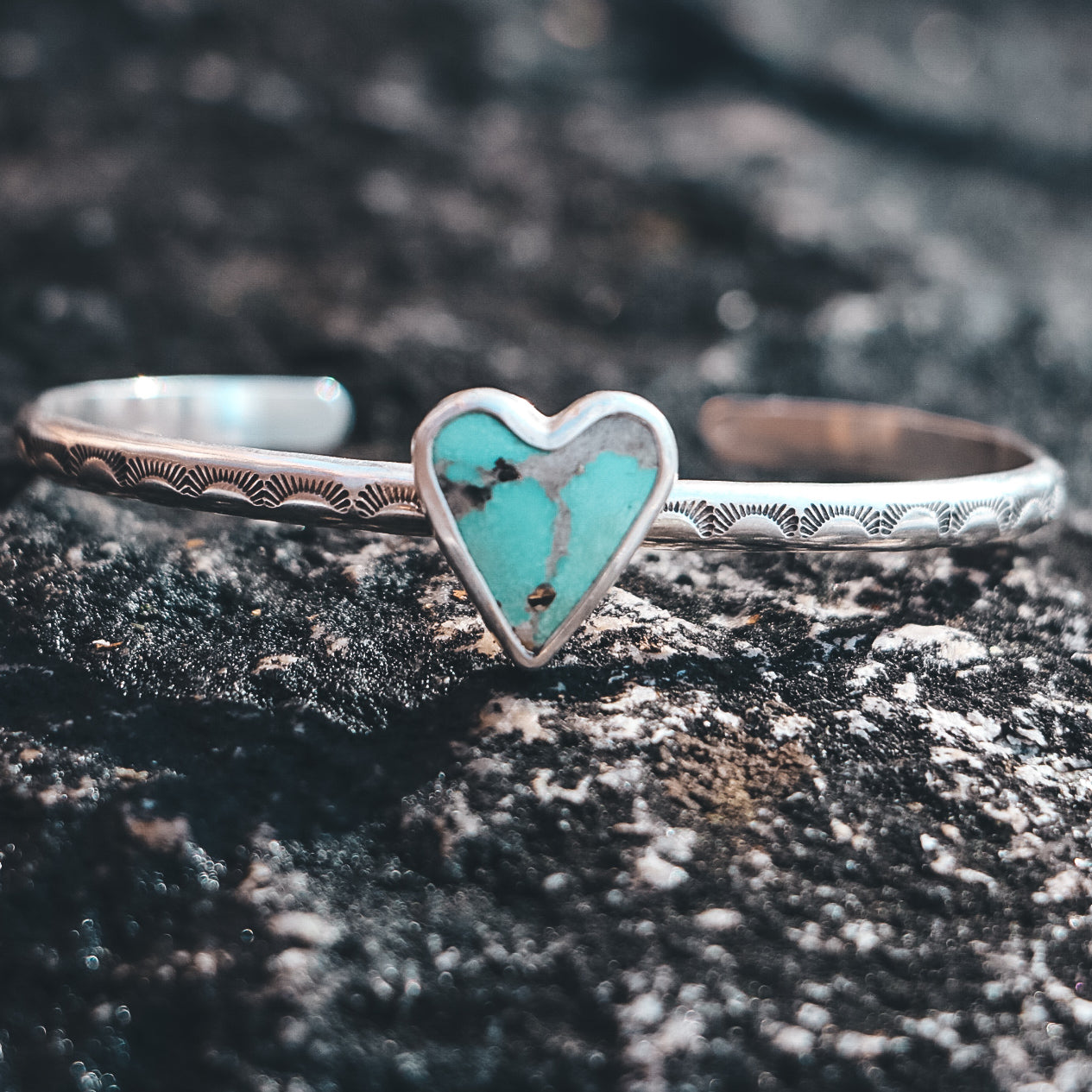 This cuff features a heart-shaped Campitos Turquoise stone and is completely one of a kind!