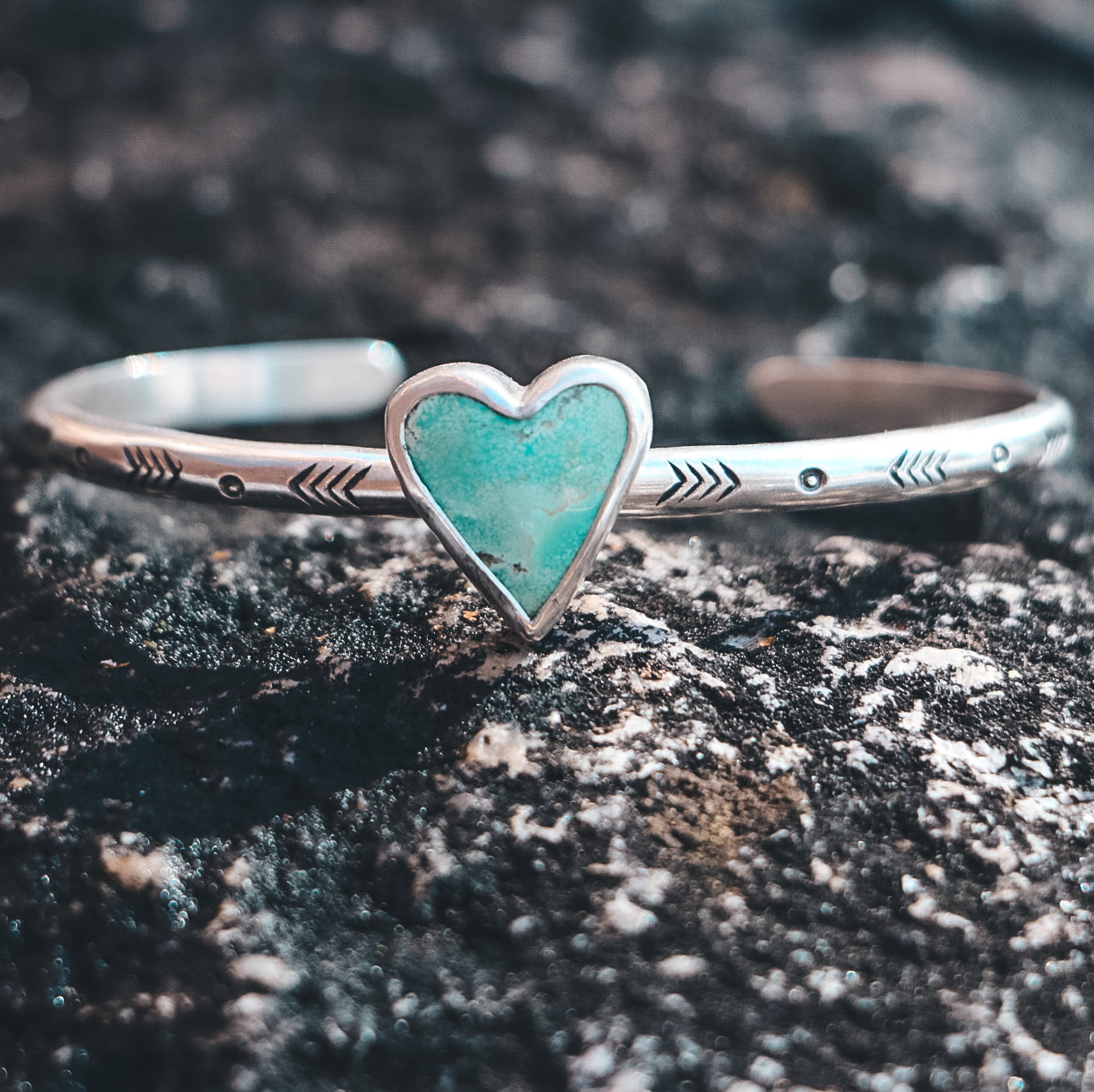 This cuff features a heart-shaped Campitos Turquoise stone and is completely one of a kind!