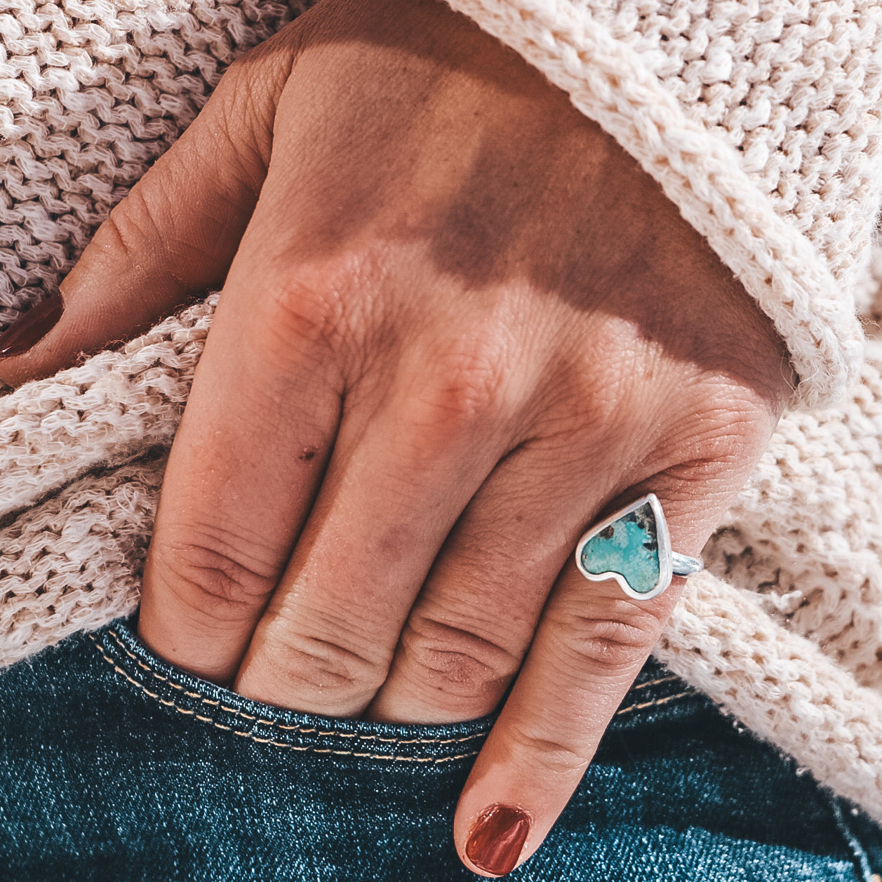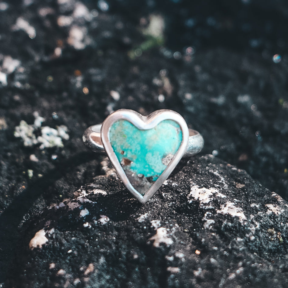 This ring features a heart-shaped Campitos Turquoise stone and is completely one of a kind!