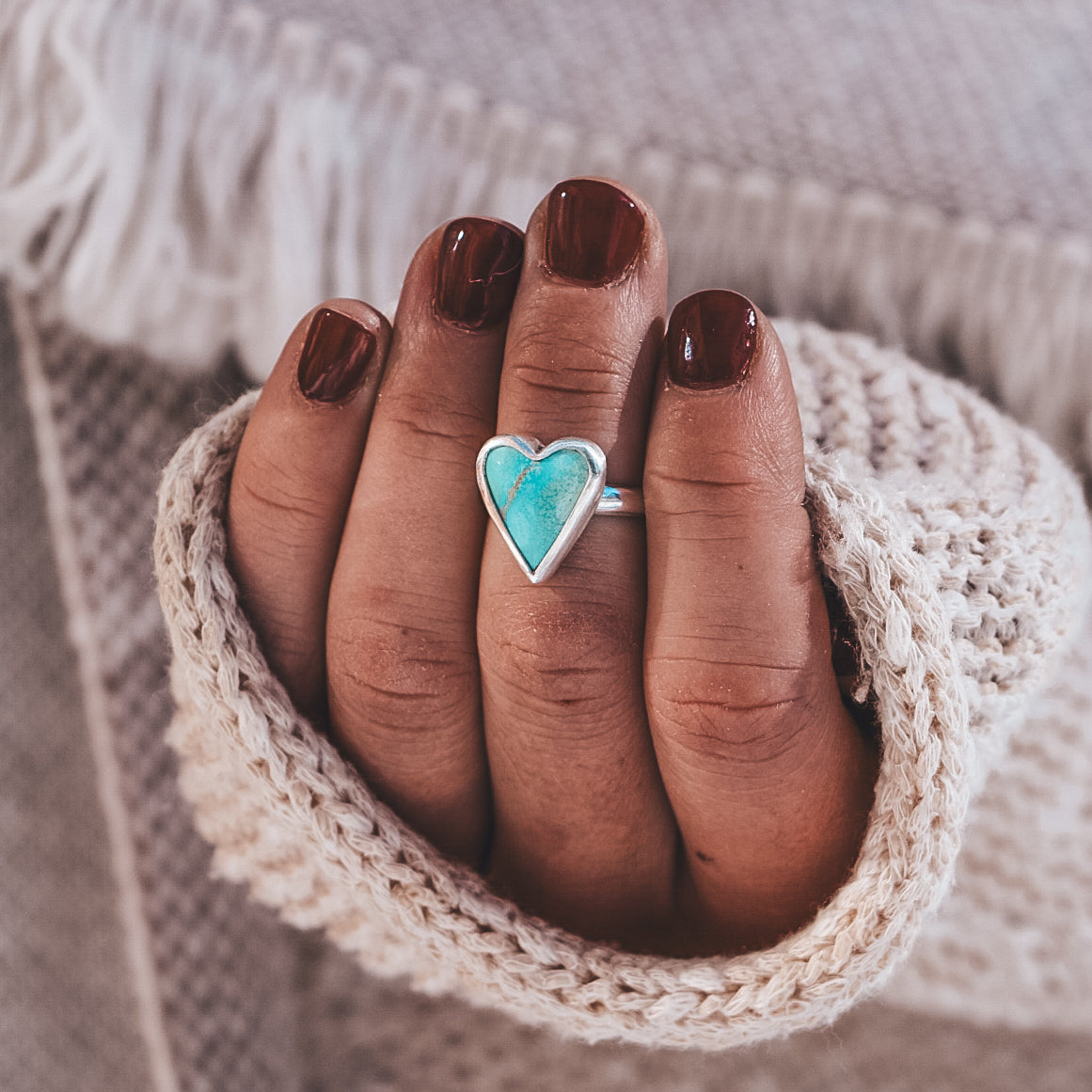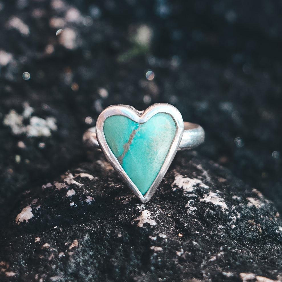 This ring features a heart-shaped Campitos Turquoise stone and is completely one of a kind!