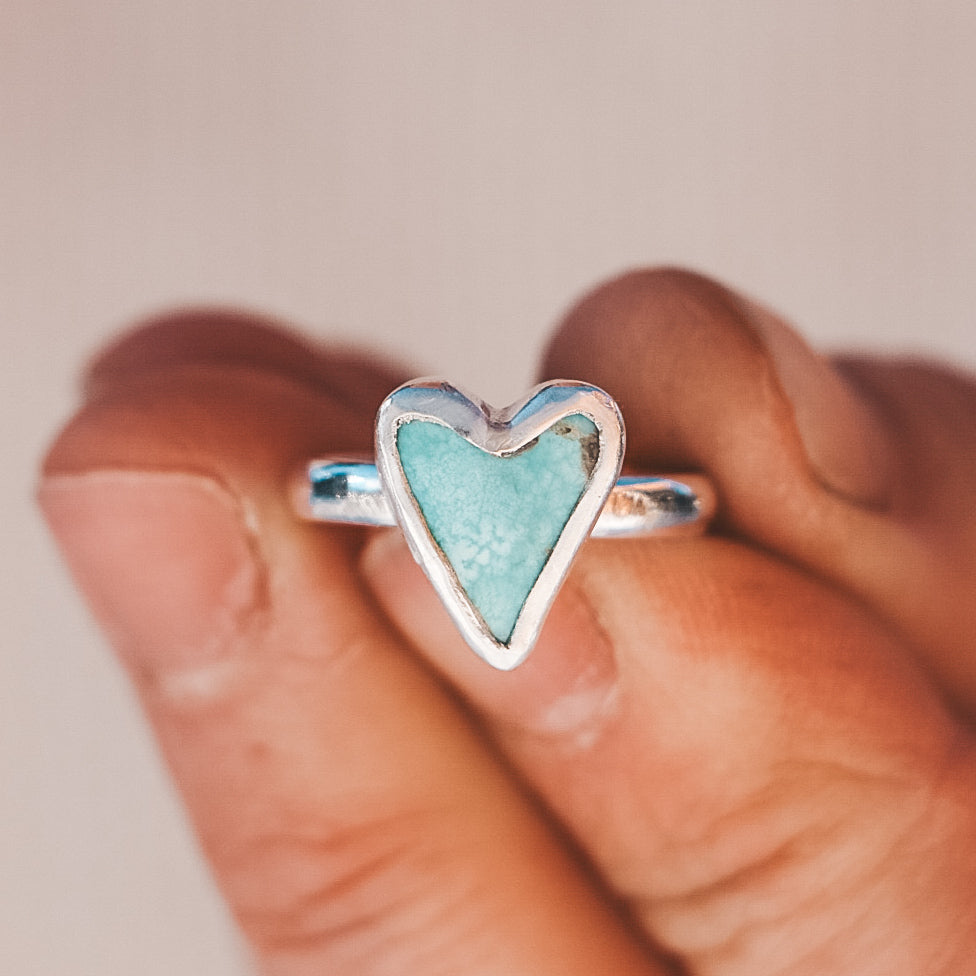 This ring features a heart-shaped Campitos Turquoise stone and is completely one of a kind!