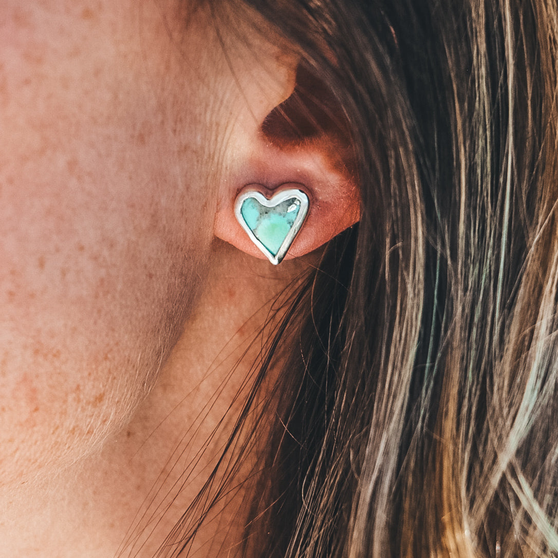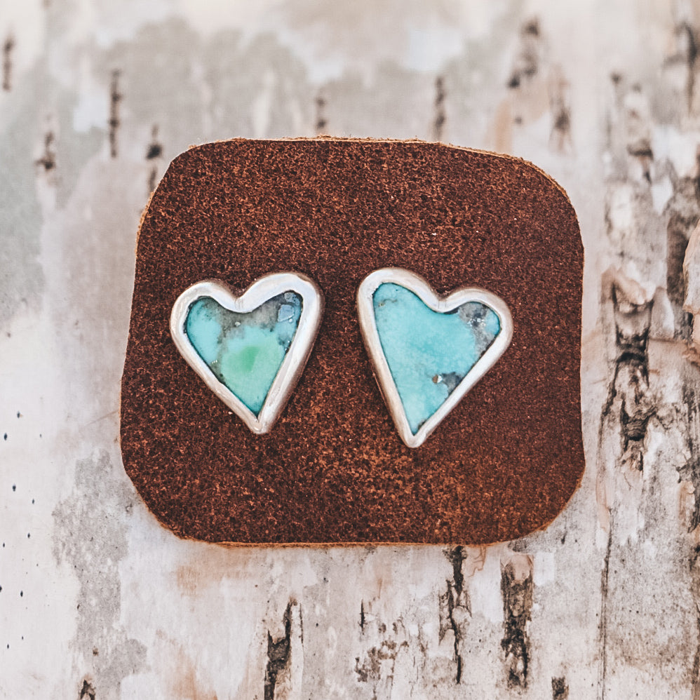 These hand-matched 'sister' earrings feature heart-shaped Campitos Turquoise stones and are completely one of a kind!