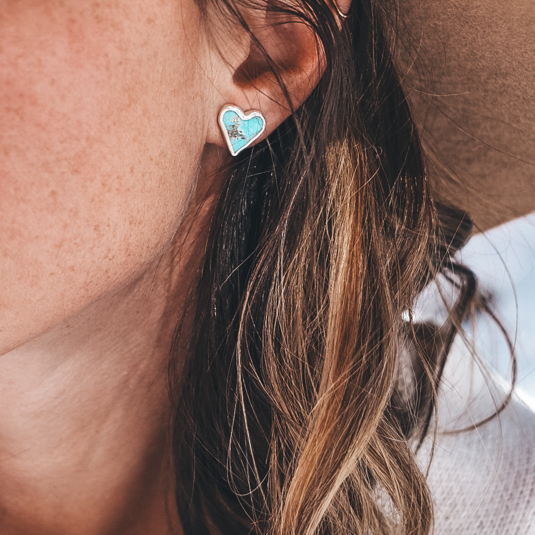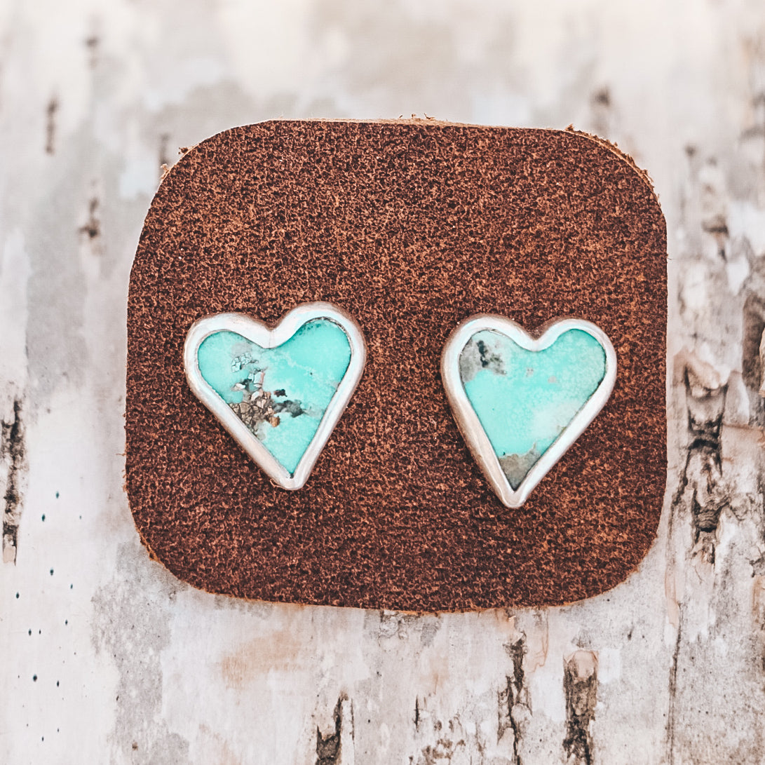 These hand-matched 'sister' earrings feature heart-shaped Campitos Turquoise stones and are completely one of a kind!