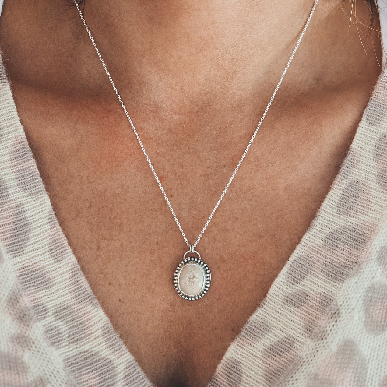 This necklace features a fossilized sand dollar set in sterling silver and fine silver. The pendant measures 24mm tall by 16mm wide, including the silver bail.