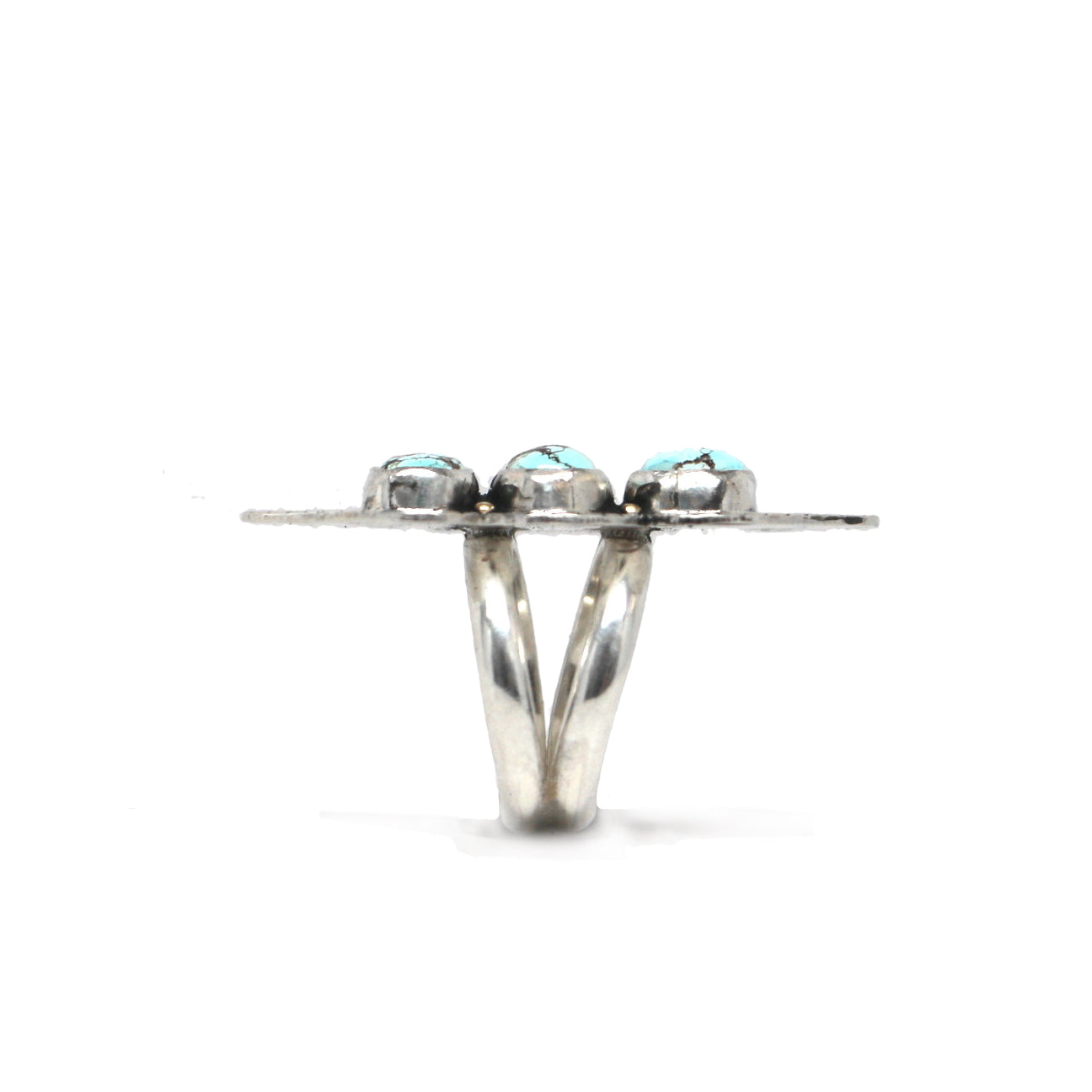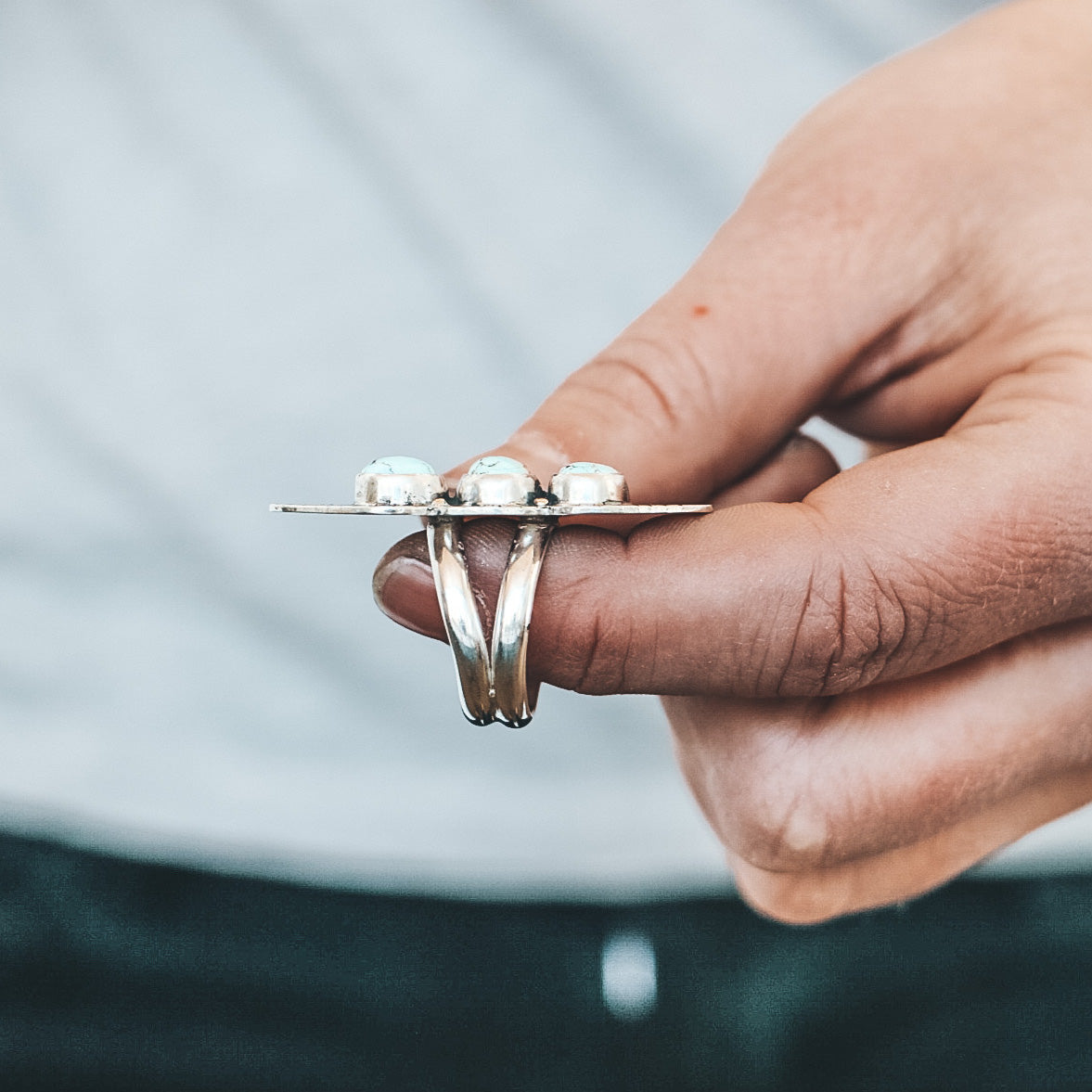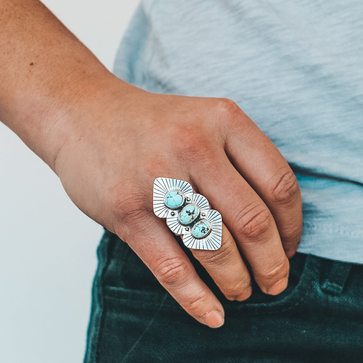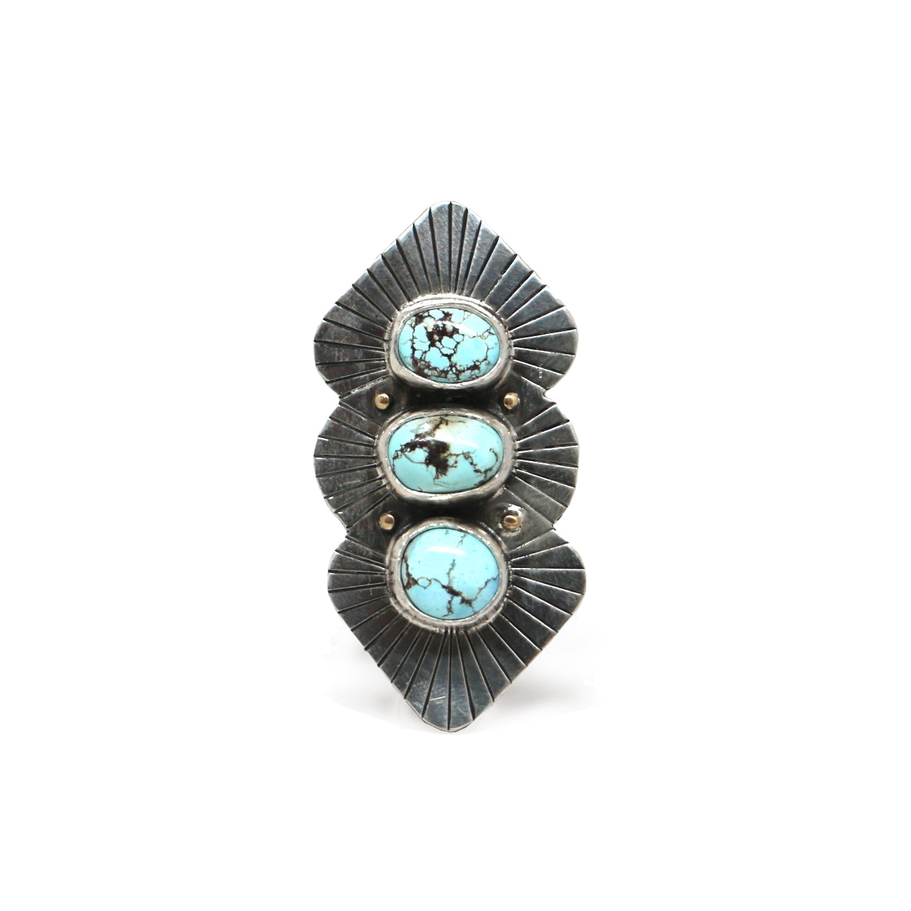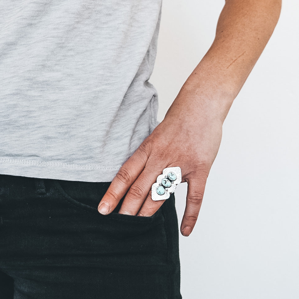 This triple stone ring features three complementary Golden Hills Turquoise stones. The stones are set in fine silver with a hand-stamped sterling silver backplate and brass details.
