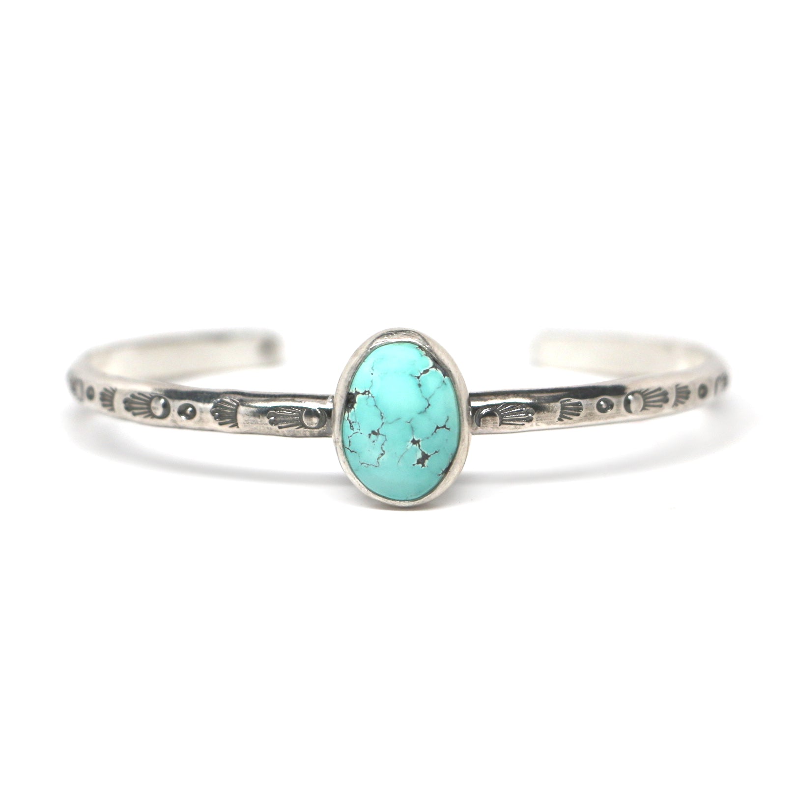 This one-of-a-kind cuff features a light teal Blue Moon Turquoise with natural grey veining and surface irregularities. The grey pockets in this stone are typical of inclusions found in natural turquoise, and in our opinion, make this stone perfectly imperfect. This cuff is made from sterling silver and fine silver, and features a hand-stamped band.