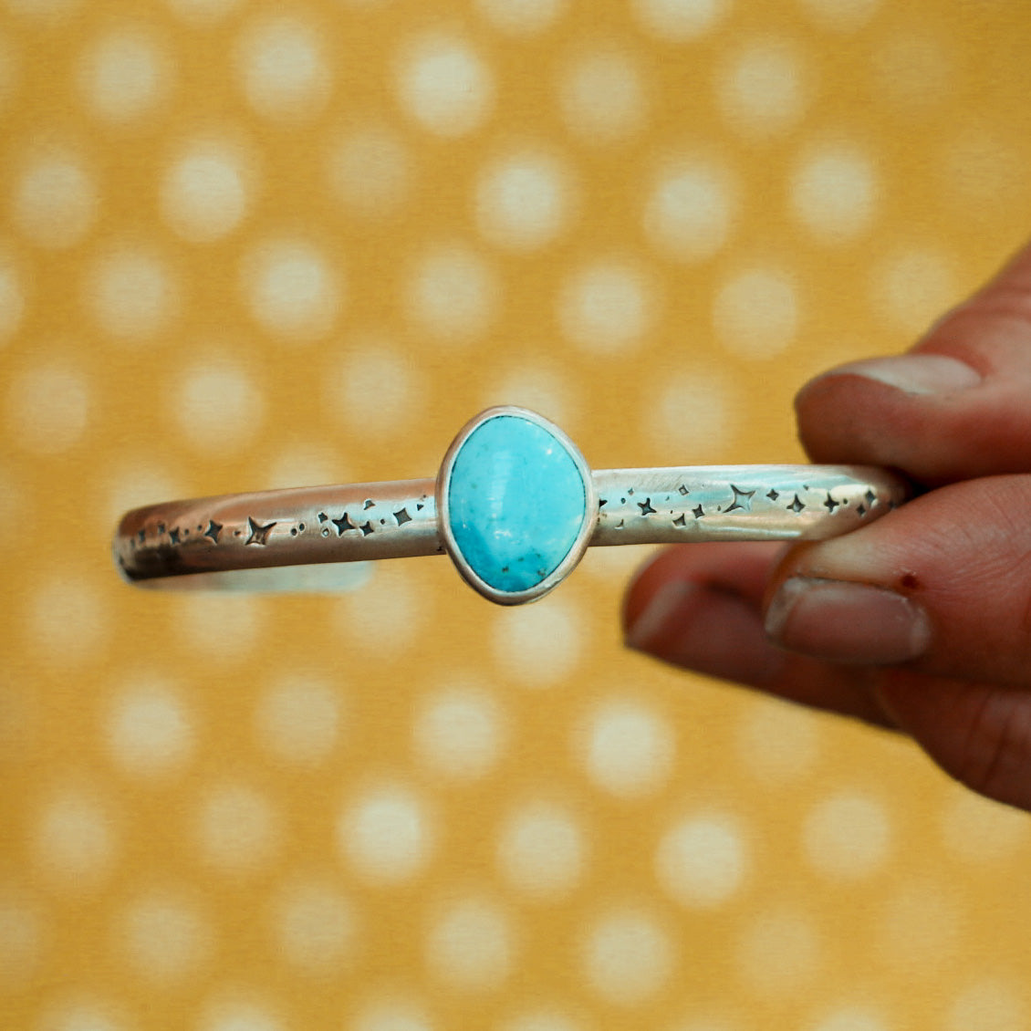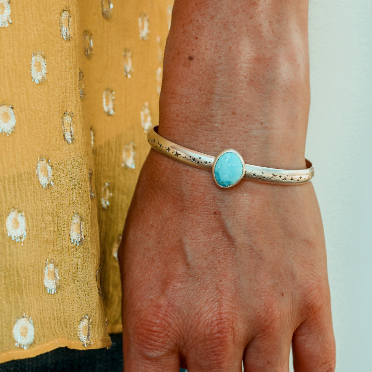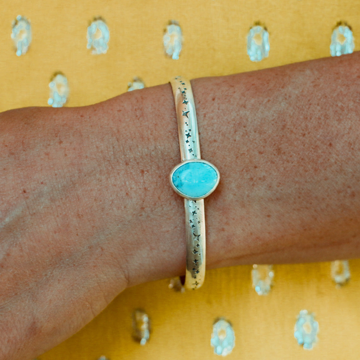 This bracelet is made from sterling silver and fine silver, and features a hand-stamped cuff with a celestial pattern. The stone centerpiece measures 12mm in width and 15mm tall.