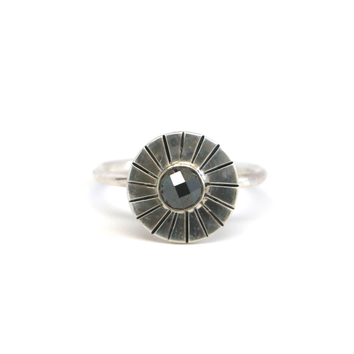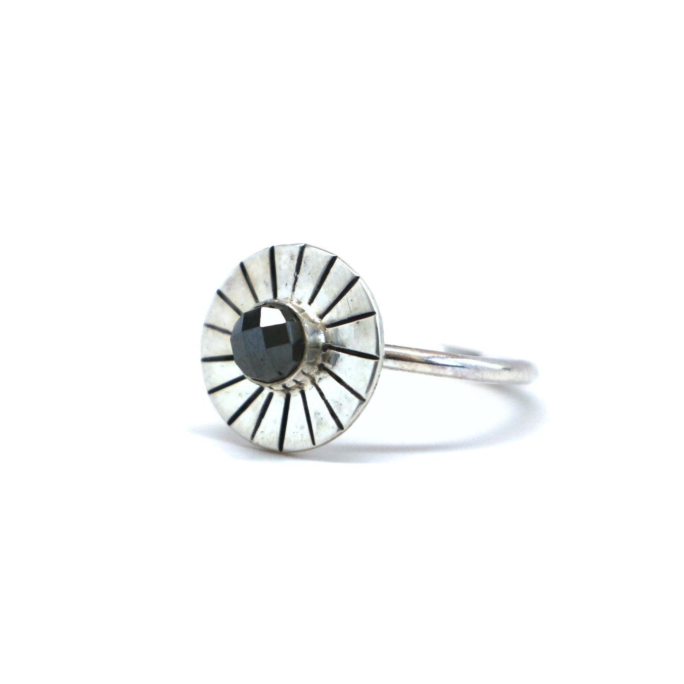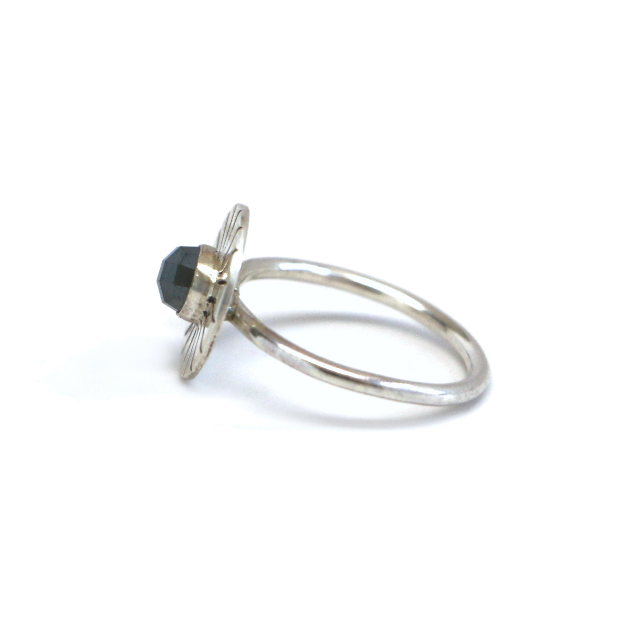 This dainty ring features a glittering faceted hematite stone. This piece is hand fabricated from sterling silver and hand stamped to give a unique patterned finish.