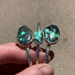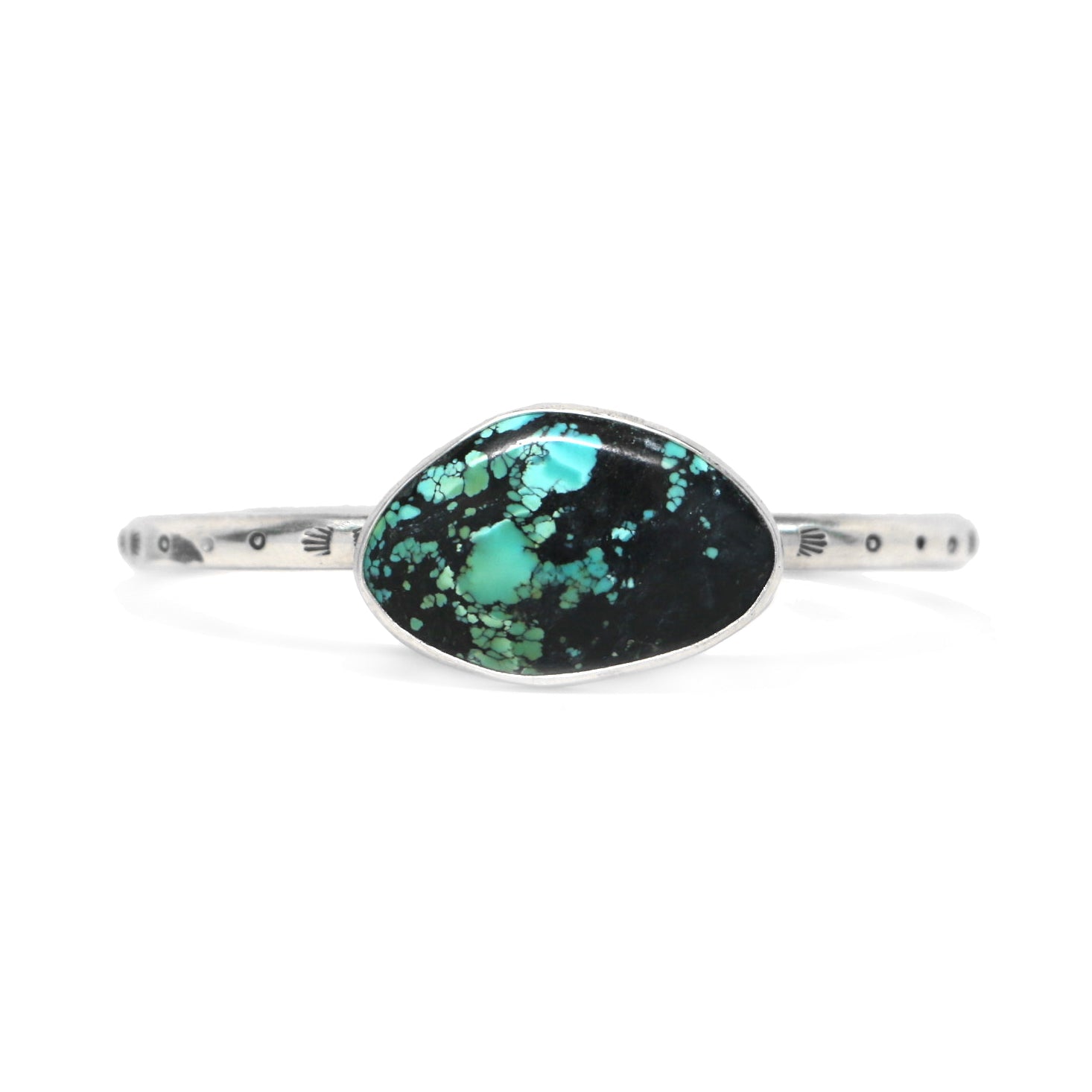 This one-of-a-kind cuff features a Hubei Turquoise, which is black in color with flecks of green and teal. This cuff is made from sterling silver and fine silver, and features a hand-stamped band. The centerpiece measures 30mm wide by 20mm tall.