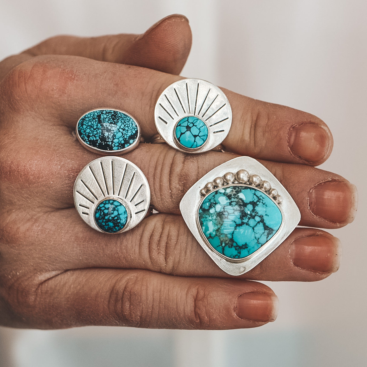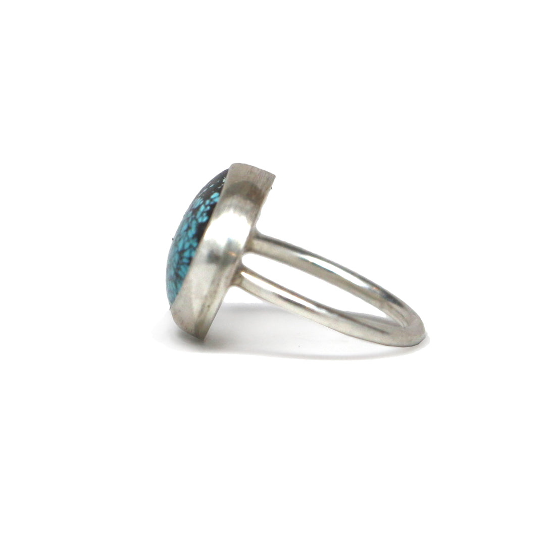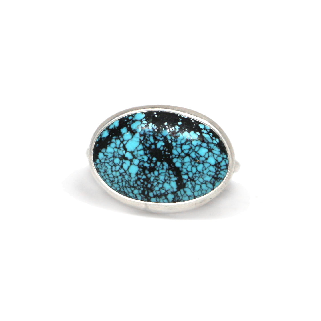 This latitude ring features a horizontally set Hubei Turquoise, mined in Hubei Province, China. The stone is deep teal with black spiderwebbing and a polished surface.
