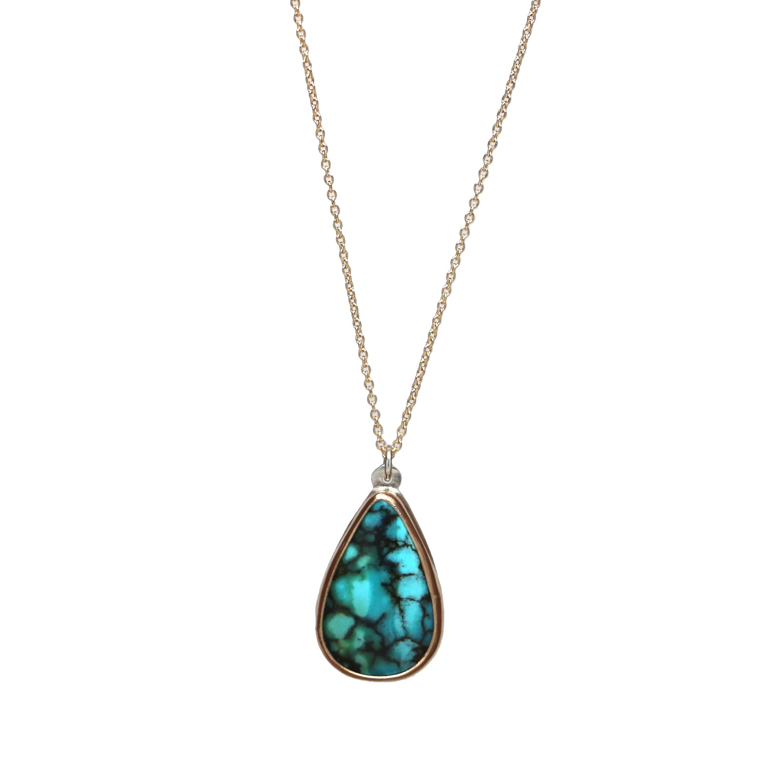 This necklace features Hubei Turquoise in hues of teal and green with natural black veining. This piece is mixed metals, with a sterling silver backplate and bail, and 14k gold filled bezel and embellishments. The pendant measures 24mm tall by 14mm wide.