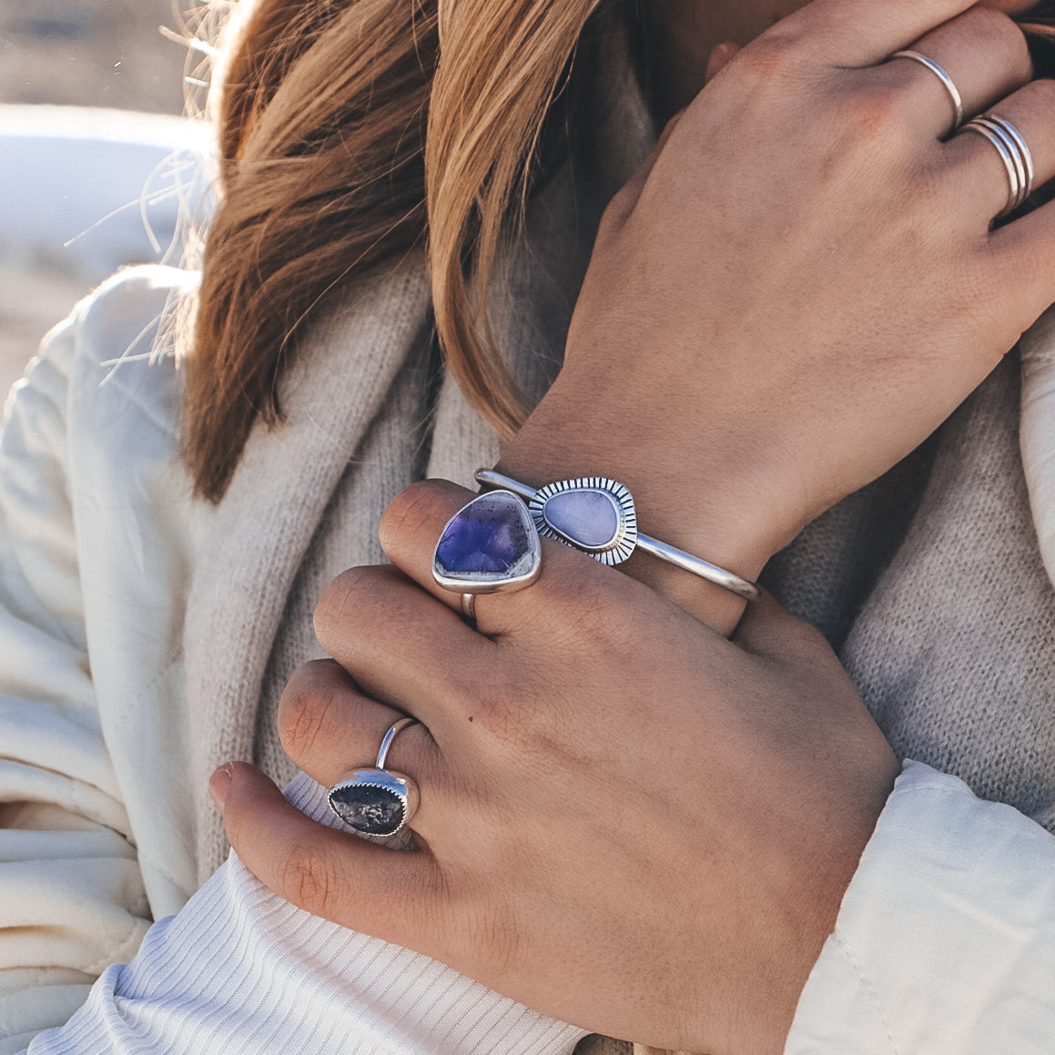 The stone measures 17mm tall by 12mm wide, and is set in sterling silver and fine silver with a smooth band.