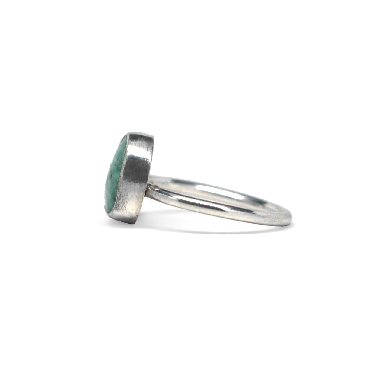 This ring features a small green-hued Kingman turquoise stone, with natural black flecks.