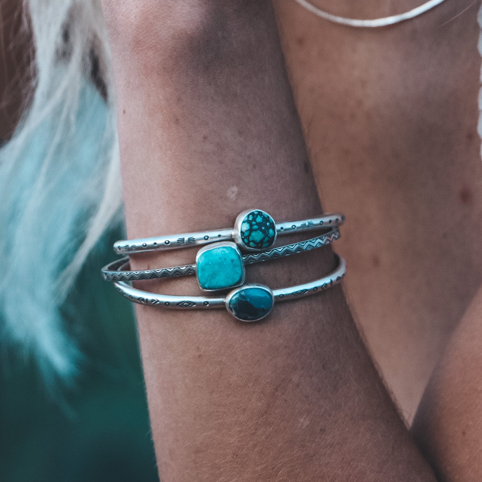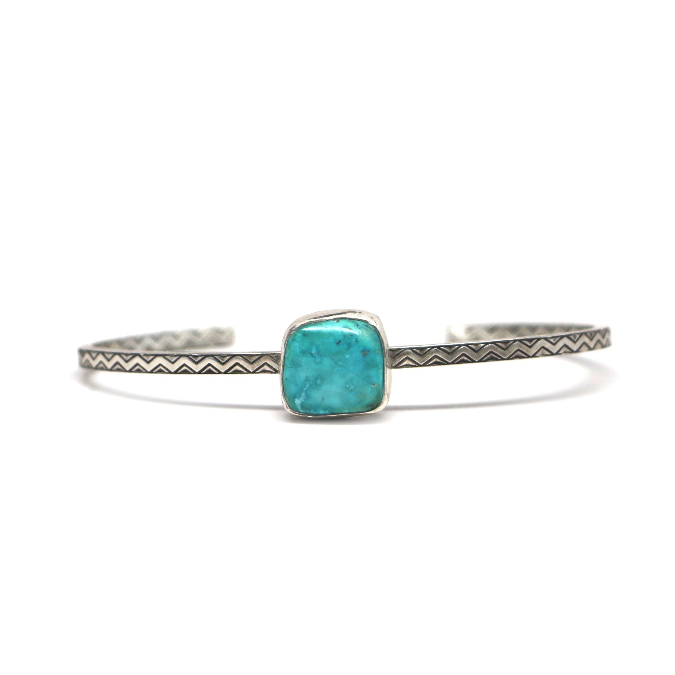 This sterling cuff features a deep teal kingman turquoise stone and a chevron patterned band.