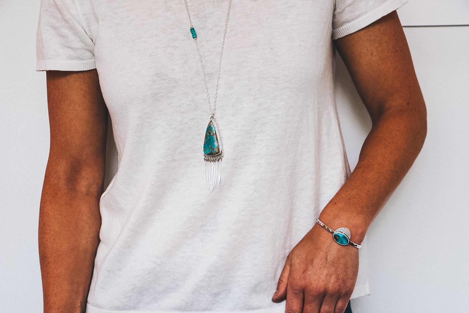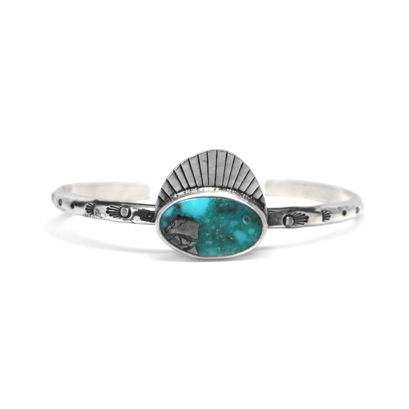This one-of-a-kind cuff features Kingman Turquoise, mined in Arizona. This top quality stone is polished to a high shine and has flecks of pyrite inclusions and is deep teal in color, with some faint variation in turquoise tones.