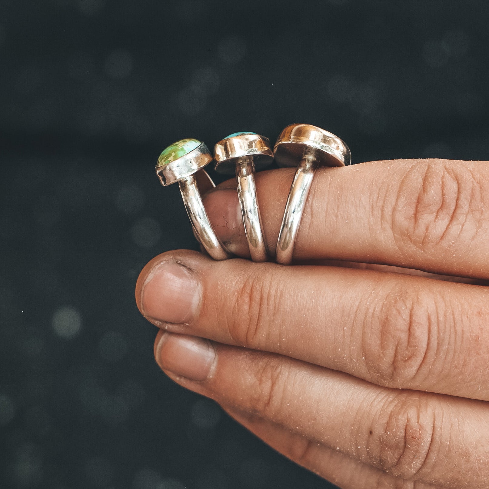 The stone measures 15mm tall by 21mm wide, and is set in sterling silver with a 14k gold fill bezel and plain sterling band.