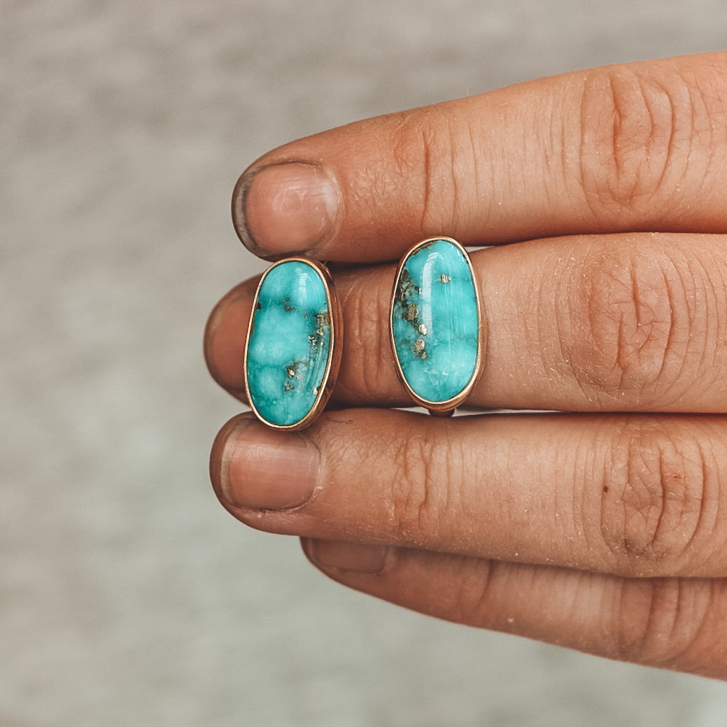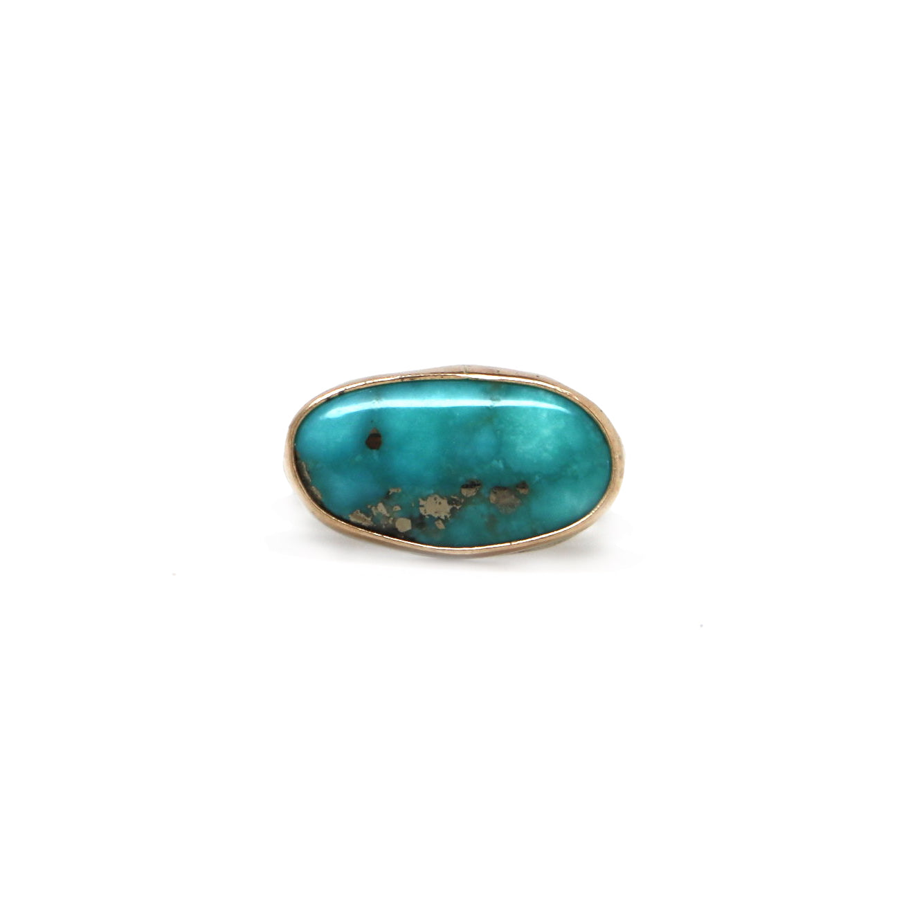 This horizontal Latitude ring features a Kingman Turquoise stone in bright teal with flecks of pyrite.