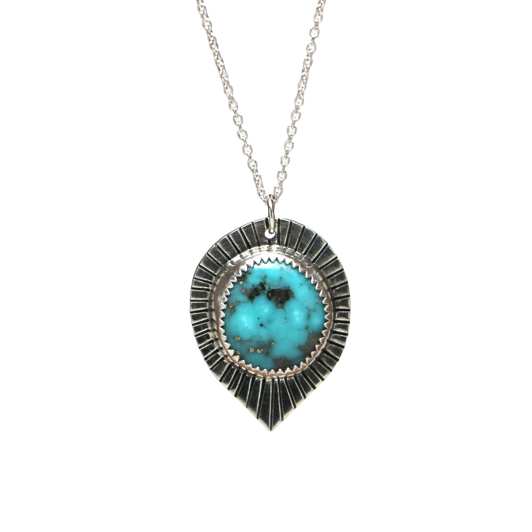 This necklace features Kingman Turquoise set in a fine silver filled bezel with a sterling silver backplate. This variety of turquoise, mined in the USA, is brilliant teal in color with natural grey inclusions. These grey flecks are traces of other minerals growing alongside the turquoise - in this case, pyrite.