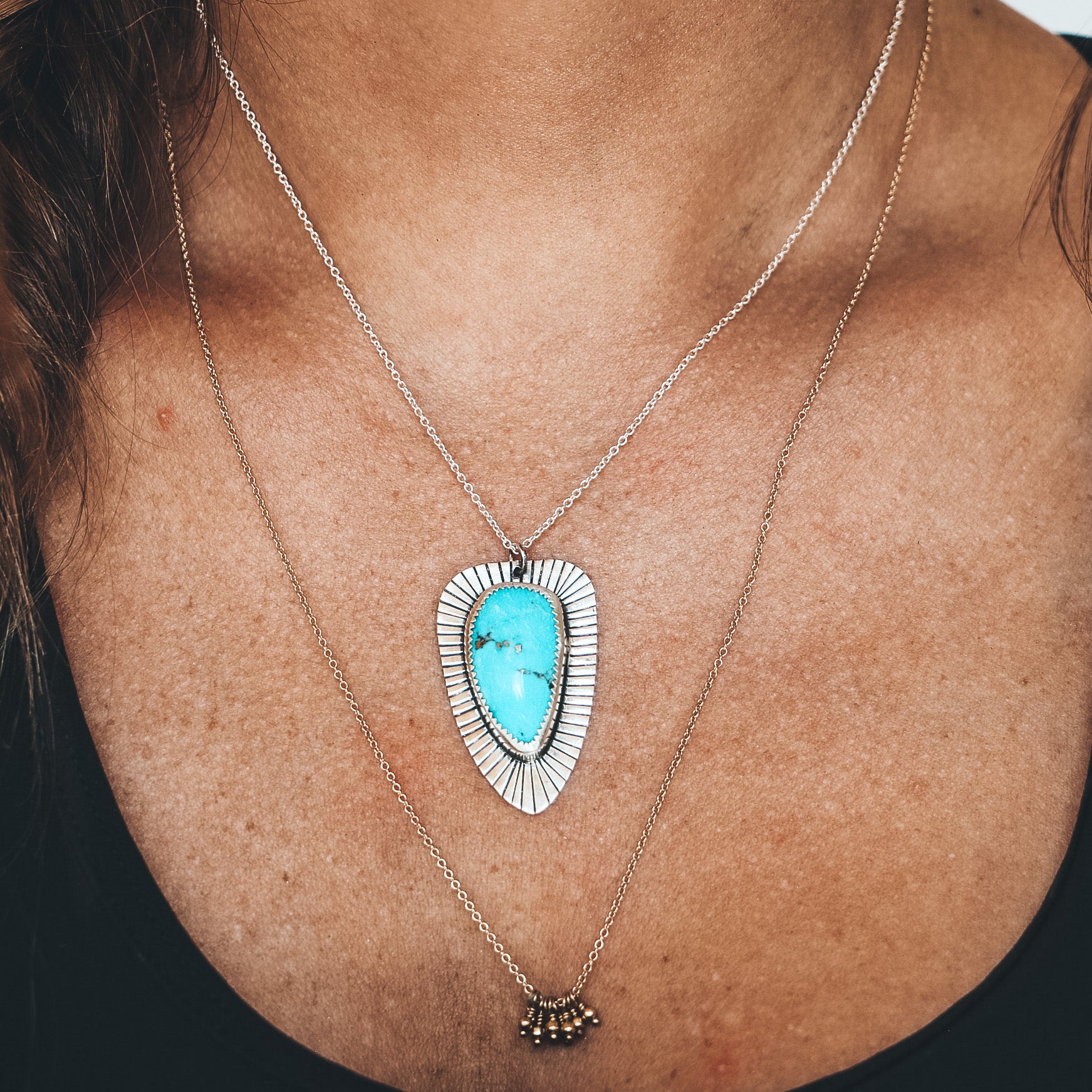 This necklace features Kingman Turquoise set in a fine silver filled bezel with a sterling silver backplate. This variety of turquoise, mined in the USA, is brilliant teal in color with natural grey inclusions. These grey flecks are traces of other minerals growing alongside the turquoise - in this case, pyrite.