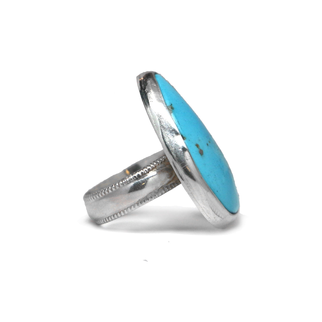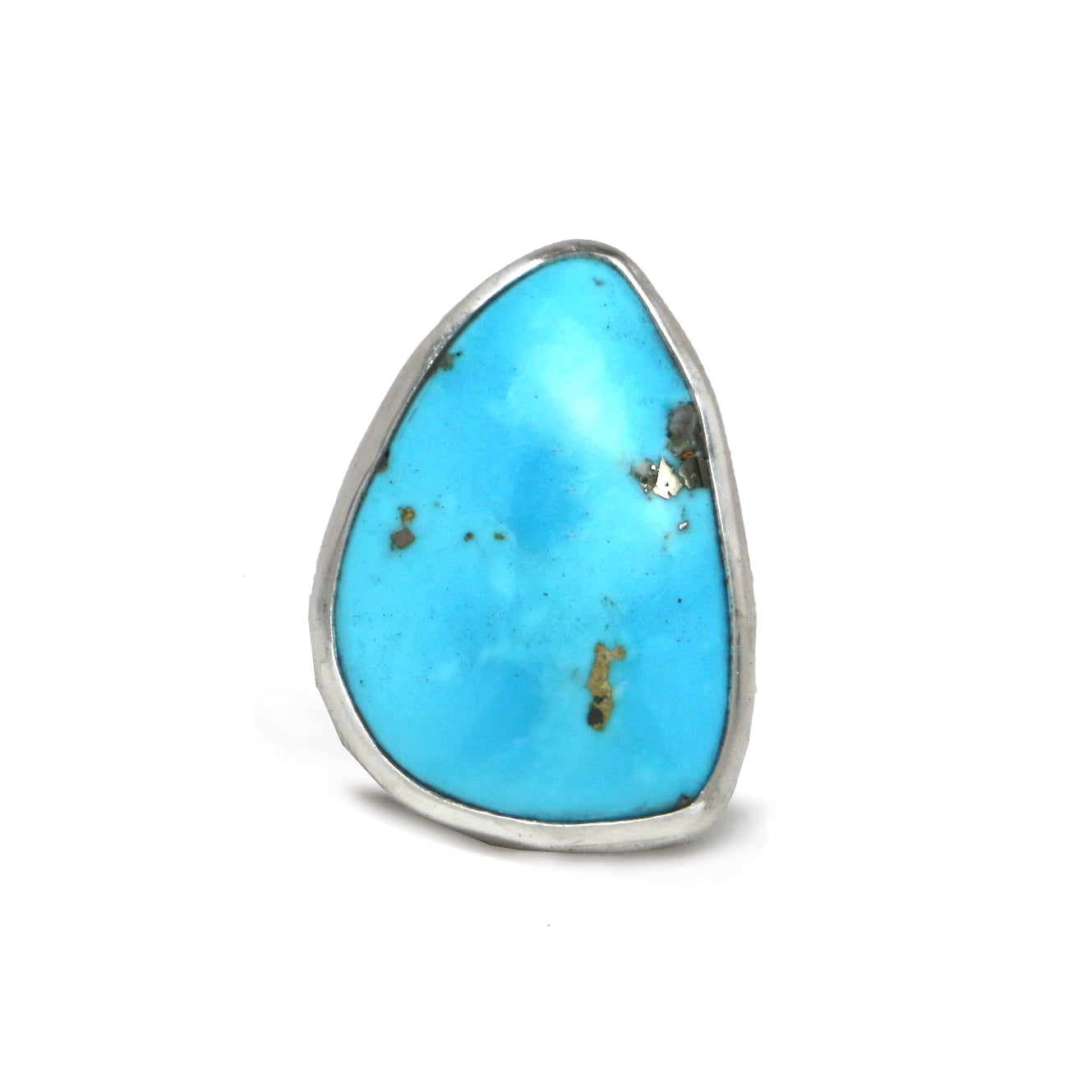 This simple ring features a brilliantly colored Kingman Turquoise, with natural pyrite inclusions.