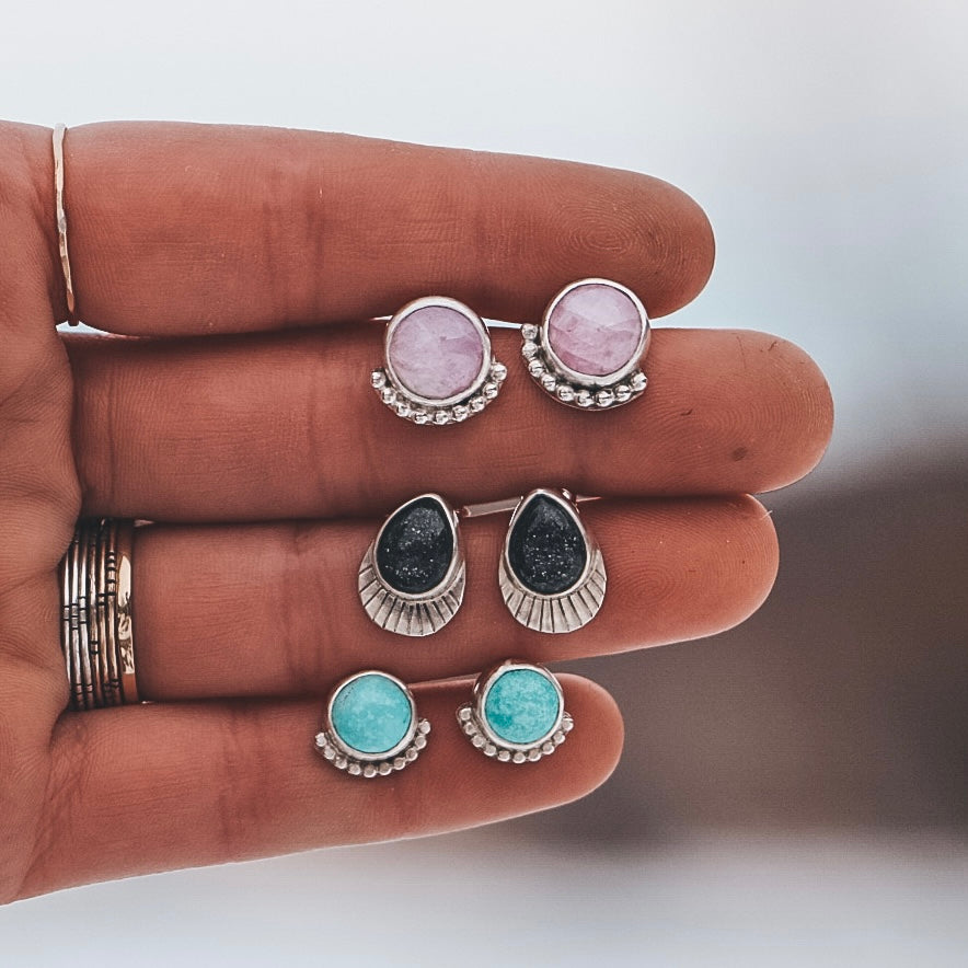The studs measure 11mm wide by 13mm tall, and are set in sterling silver and fine silver.