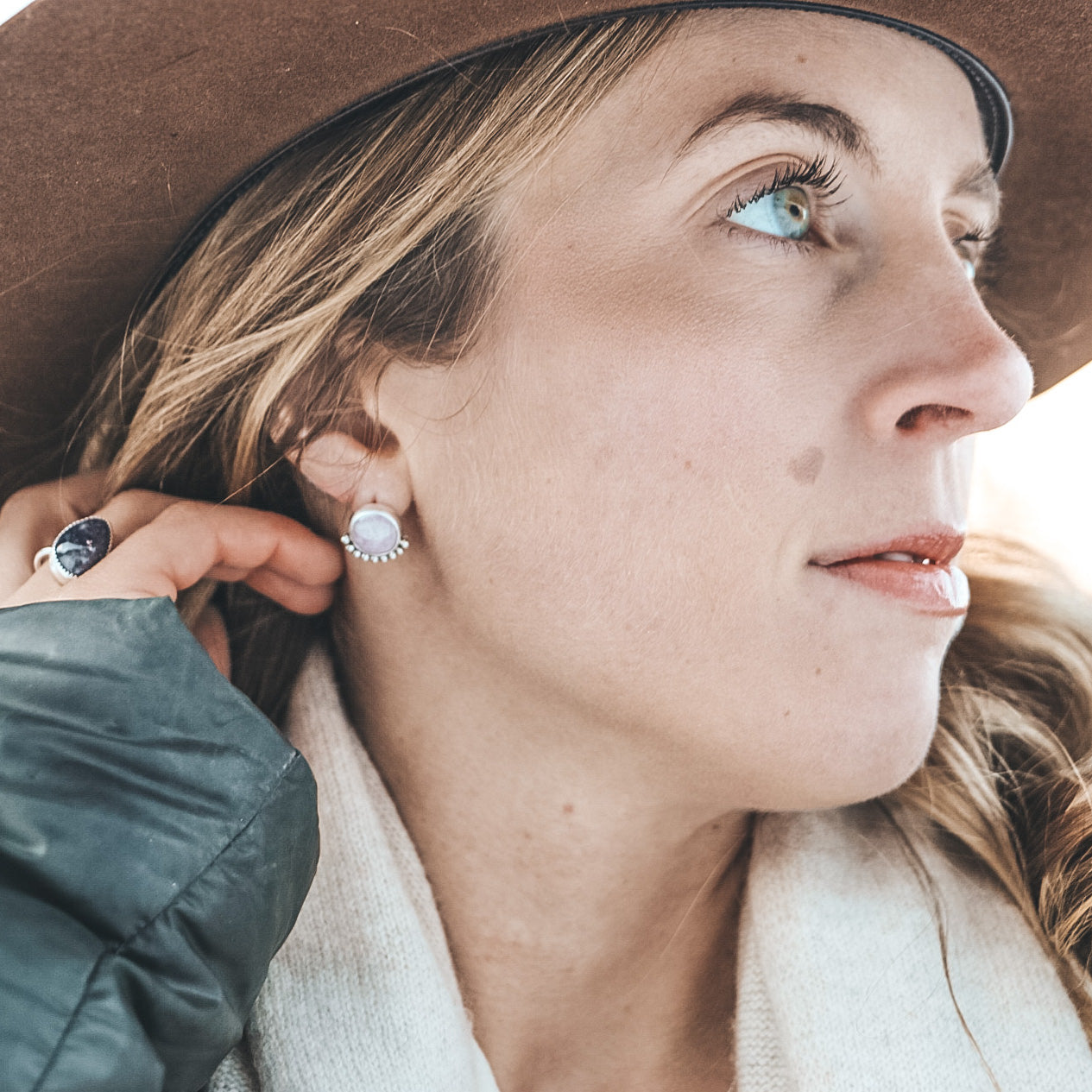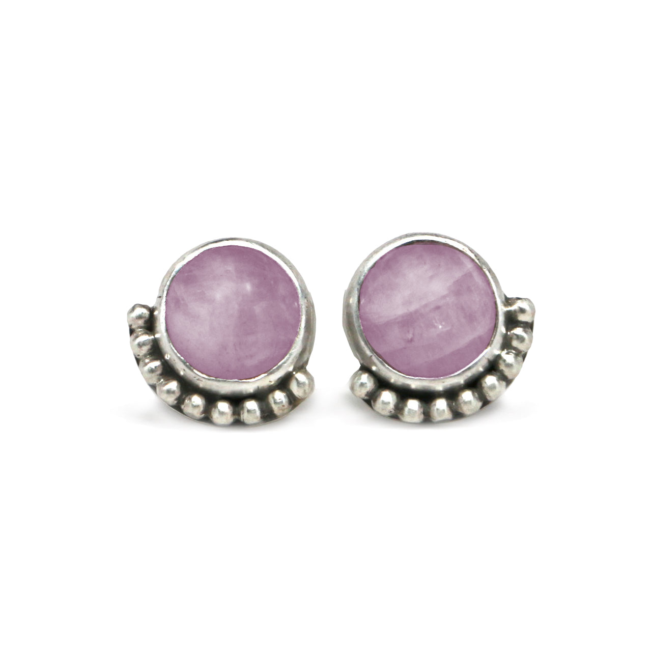 These dainty studs feature round kunzite stones, which are light pink with some natural white cloudiness.