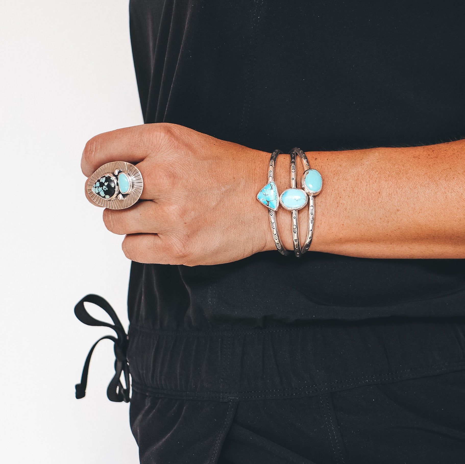 This one-of-a-kind cuff features a gorgeous Lavender Turquoise, mined in Kazakhstan. This top quality stone is polished to a high shine and has natural brown veining. The cuff is made from sterling silver and fine silver, and features a hand-stamped band. The stone measures 18mm wide by 13mm tall.