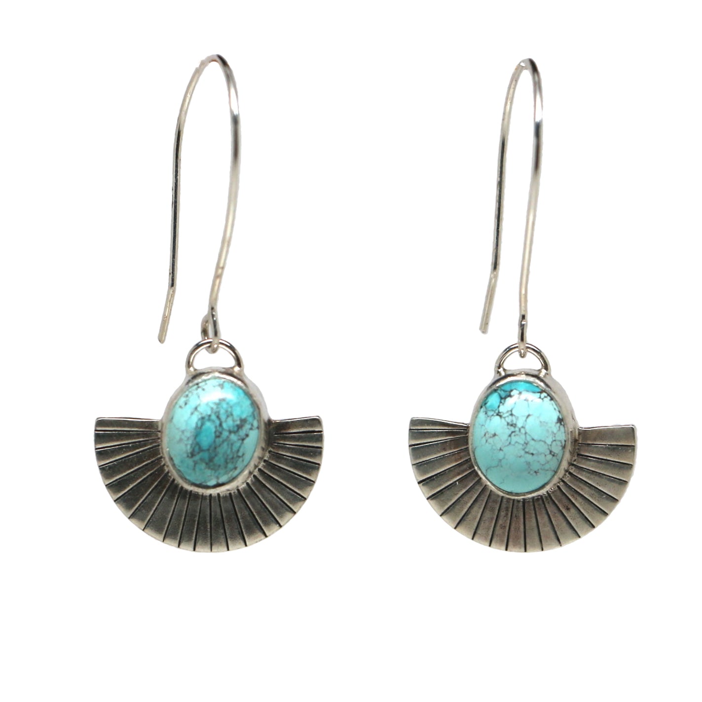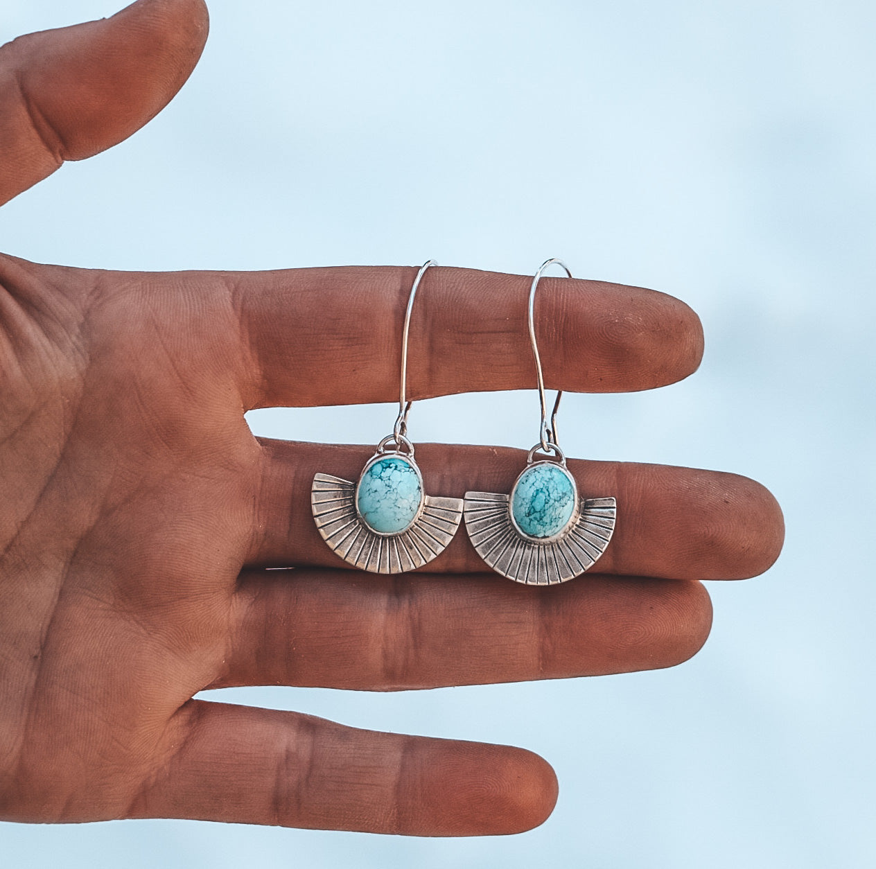 The Fan Dangles are Mineral + Mine's newest take on our popular Fan Stud! Lightweight as always, these fan earrings feature our signature straight line sunburst pattern alongside Ma'anshan turquoise, mined in the Ma'anshan region of China. This variety of turquoise has a bright teal color with natural black and brown veining.