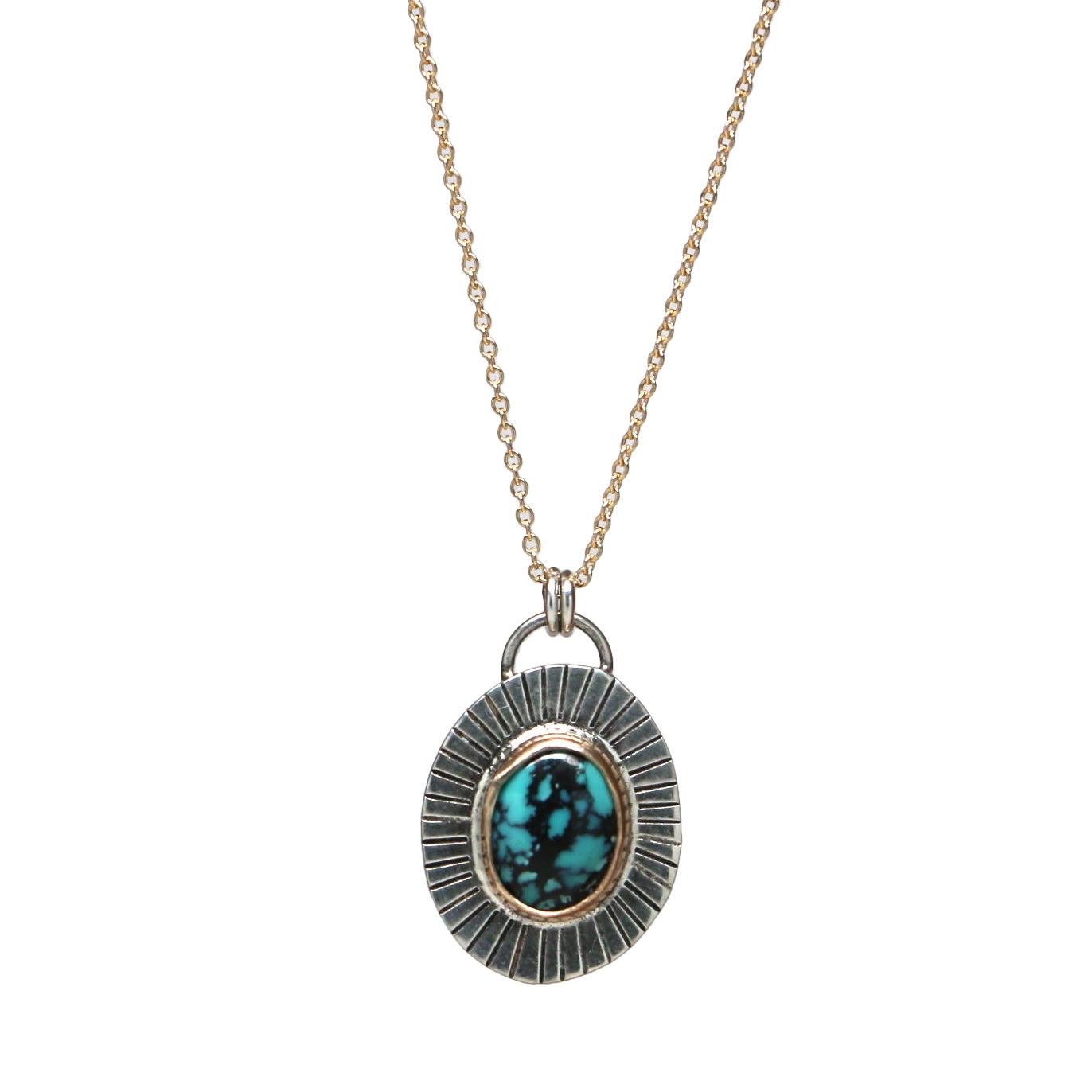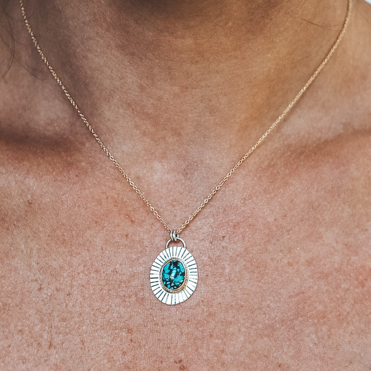 This necklace features Ma'anshan Turquoise in bright teal and green with natural black veining. This piece is mixed metals, with a sterling silver backplate and bail, and 14k gold filled bezel. The pendant measures approximately 23mm tall by 16mm wide.