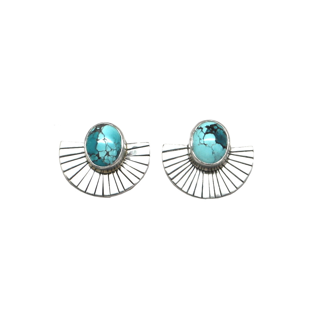 These statement fan studs feature Ma'anshan turquoise, mined in the Ma'anshan region of China. This variety of turquoise has a bright teal color with natural black and brown veining.