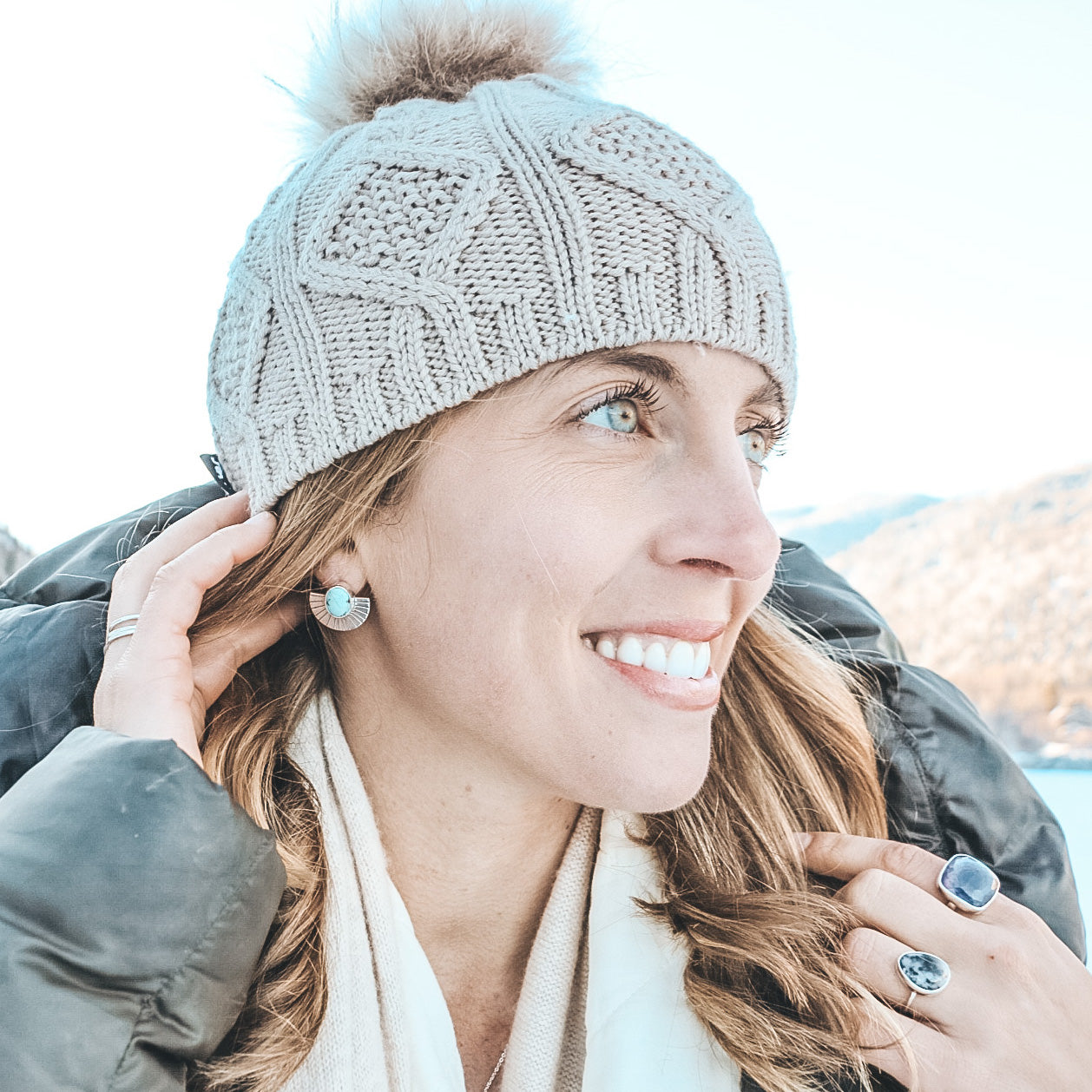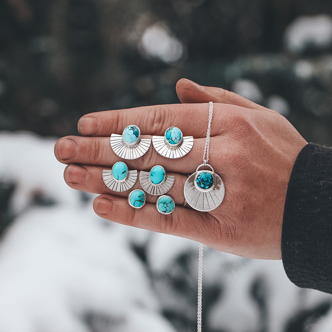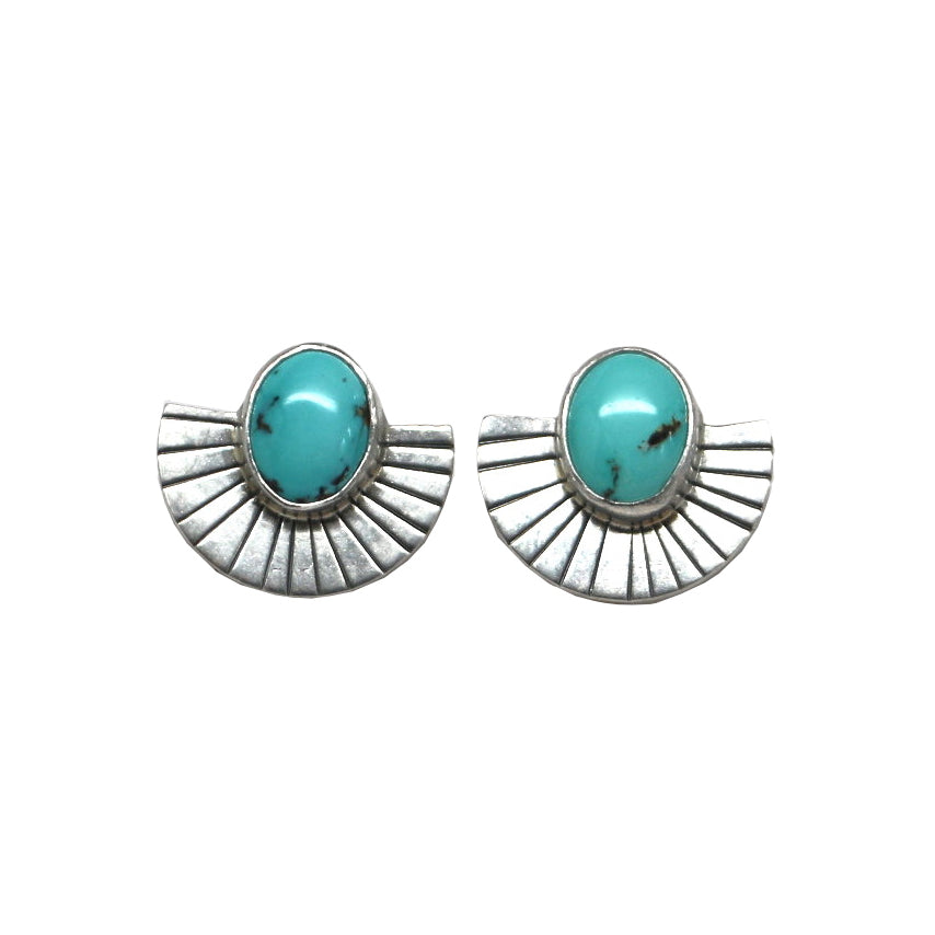 These statement fan studs feature Ma'anshan turquoise, mined in the Ma'anshan region of China. This variety of turquoise is bright teal in color with natural black and brown veining.