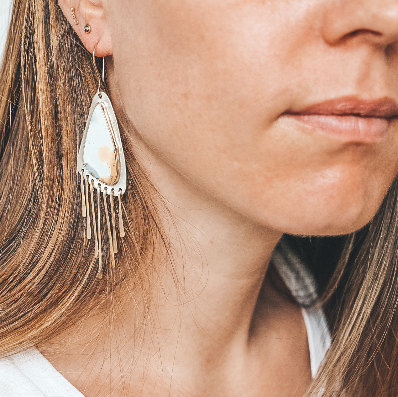 The natural jasper stones are light grey in color with flecks of dark grey and highlights of creamsicle-orange. These earrings measure 3.75" in length and are set on a sterling silver backplate with 14k gold filled bezel, fringe, and earwires. The sterling backplates have hand-sawn cutouts, which show off the back of the stones and reduce some weight in the earrings.