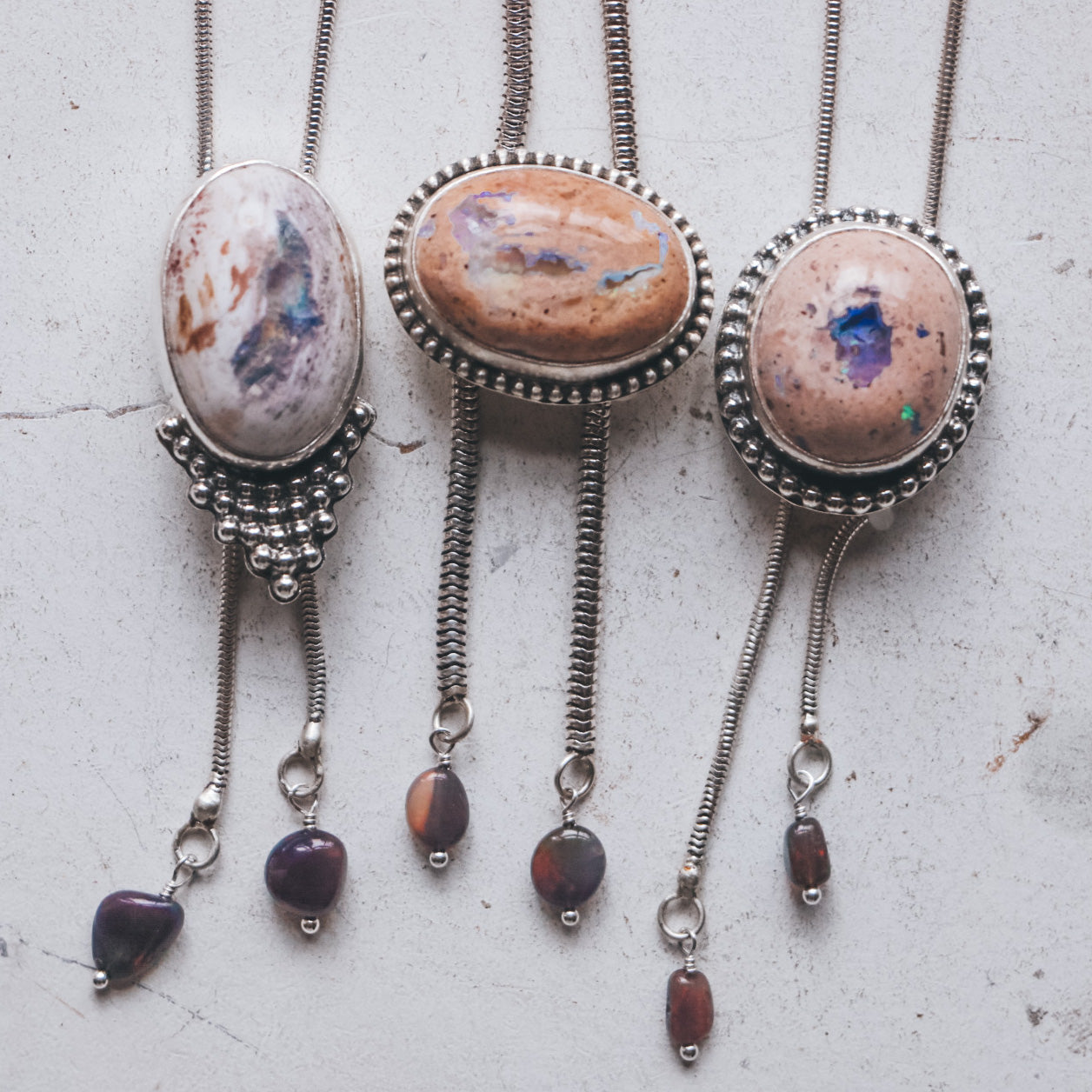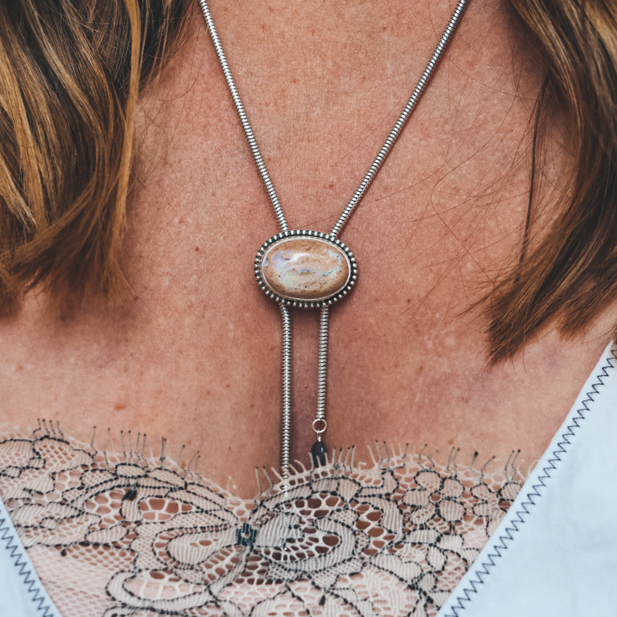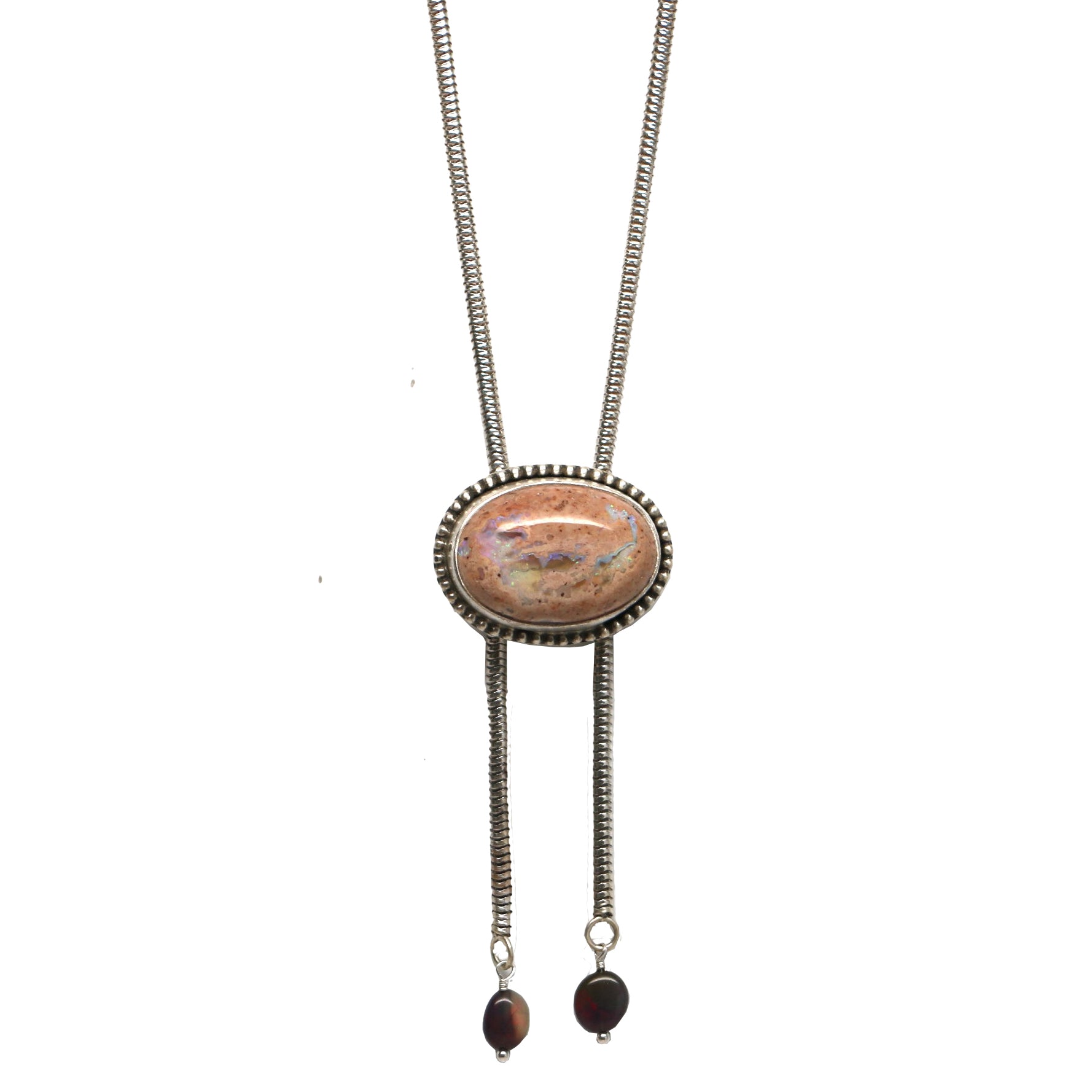 This chain bolo tie features a stunning Mexican Opal in sandy-peach with a large sparkling pool of opal fire. The stone is framed in fine silver and sterling silver, and has a handmade slide on the backside. The tails of the chain have wire-wrapped black opal details.