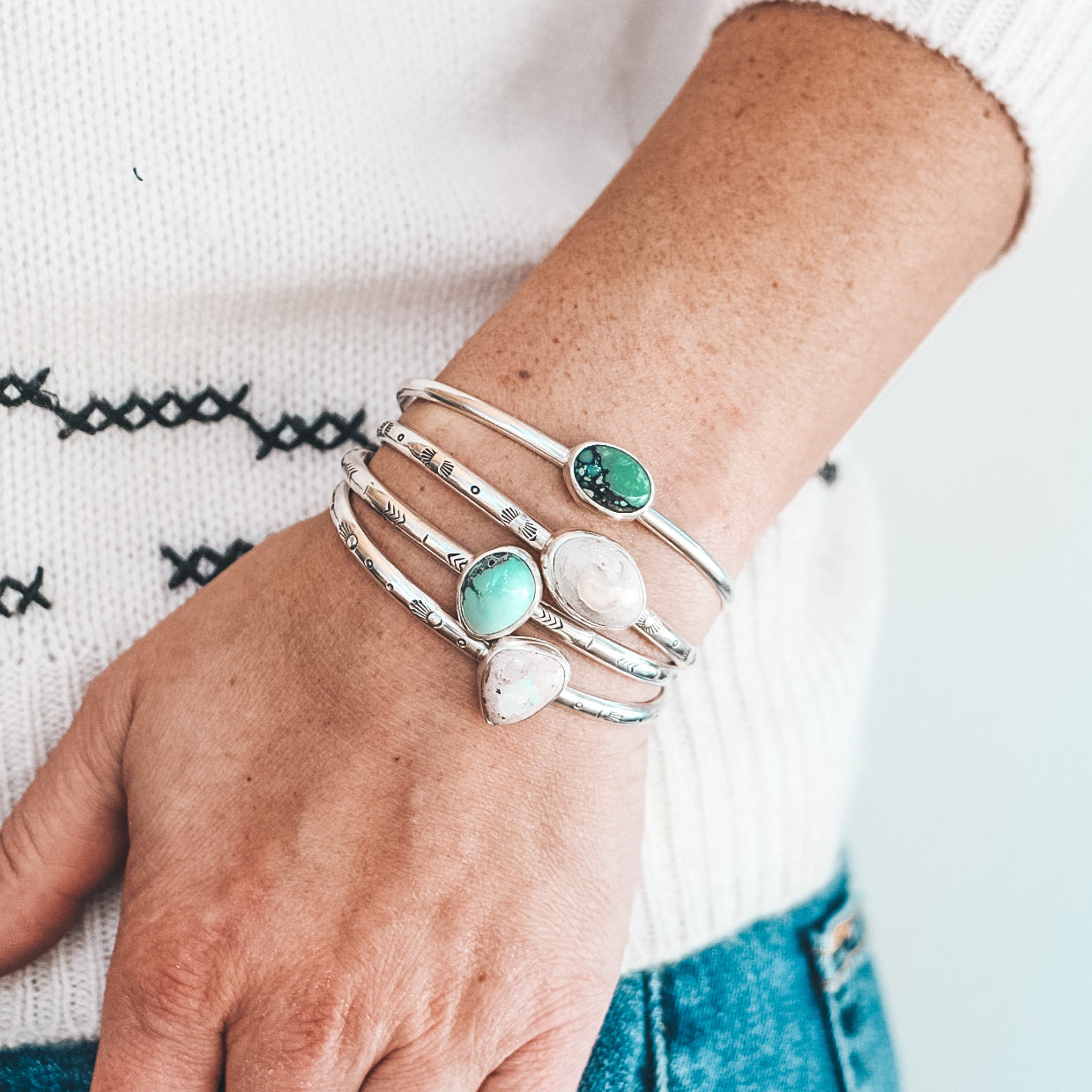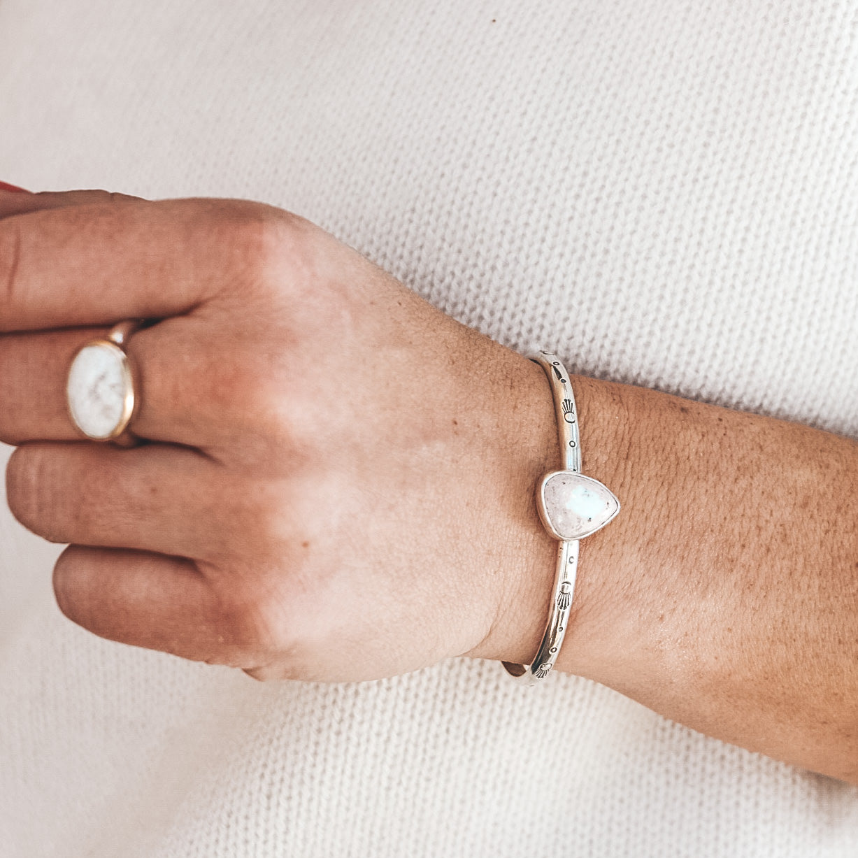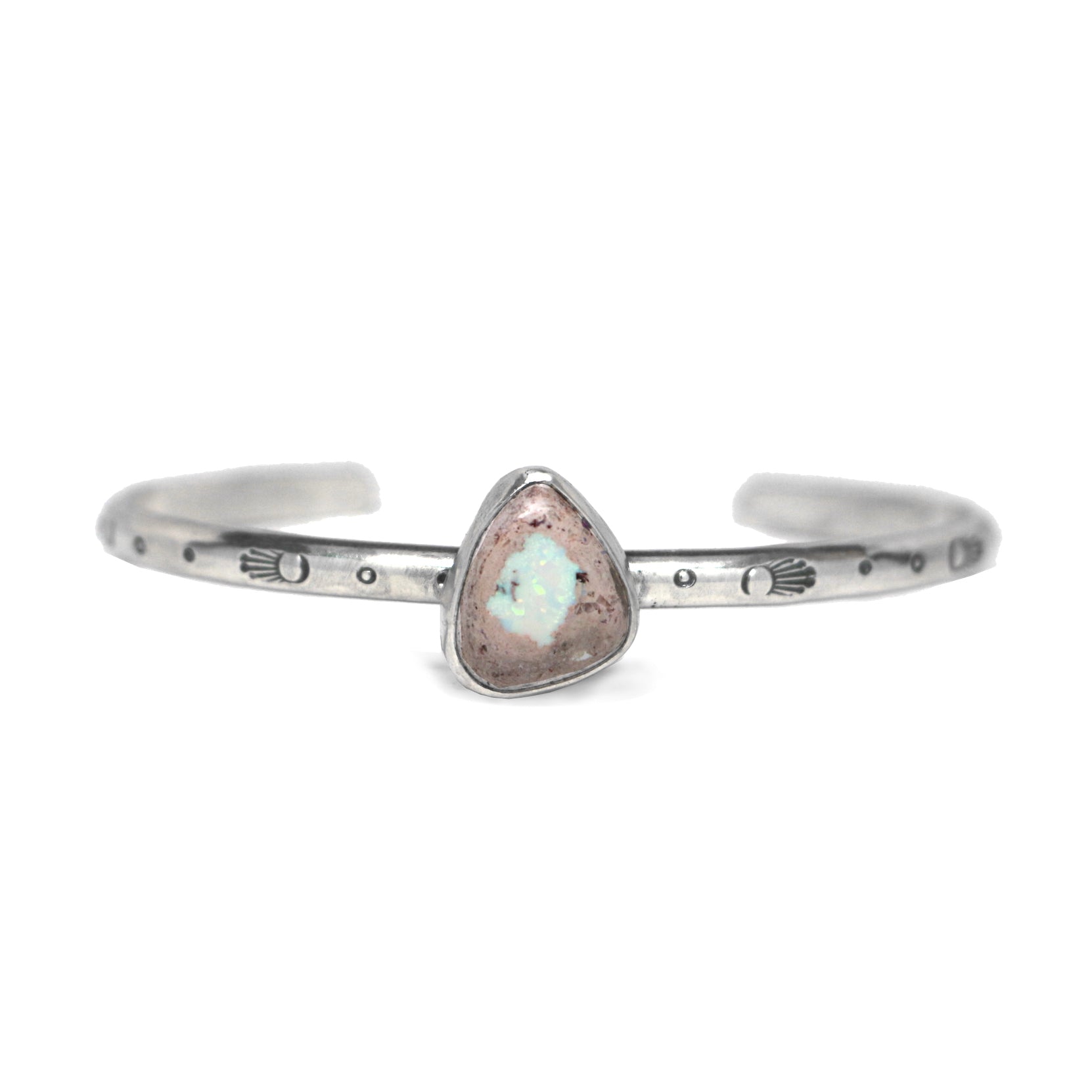 This one-of-a-kind cuff features a Mexican Opal with a sandy-peach matrix and a central pocket of glittering opal fire. This cuff is made from sterling silver and fine silver, and features a hand-stamped band. The centerpiece measures 14mm wide by 16mm tall.