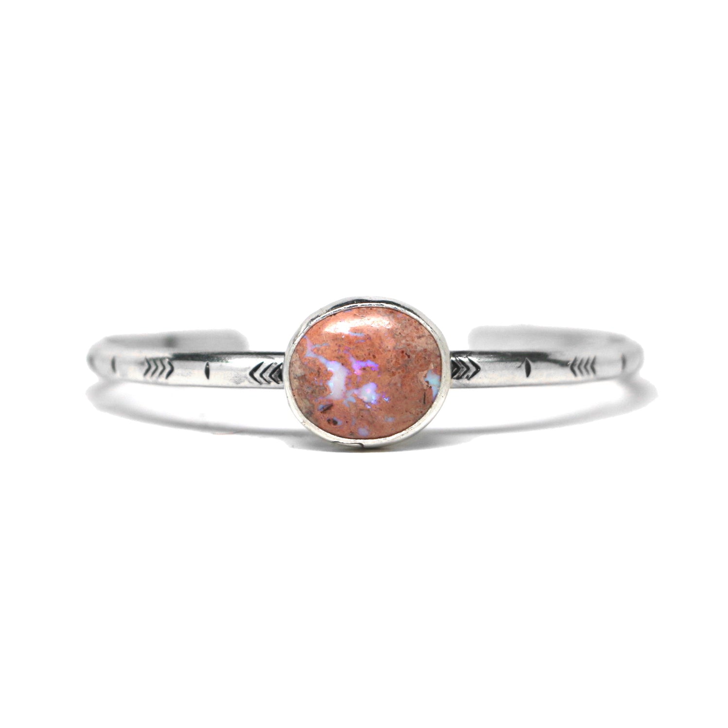 This one-of-a-kind cuff features a Mexican Opal with a sandy-peach matrix and multiple milky pockets of opal fire. This cuff is made from sterling silver and fine silver, and features a hand-stamped band. The centerpiece measures 16mm wide by 18mm tall.