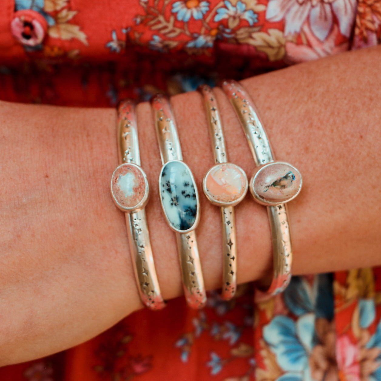 This cuff is made from sterling silver and fine silver, and features a hand-stamped band with a celestial pattern. The stone centerpiece measures 13mm wide by 13mm tall.