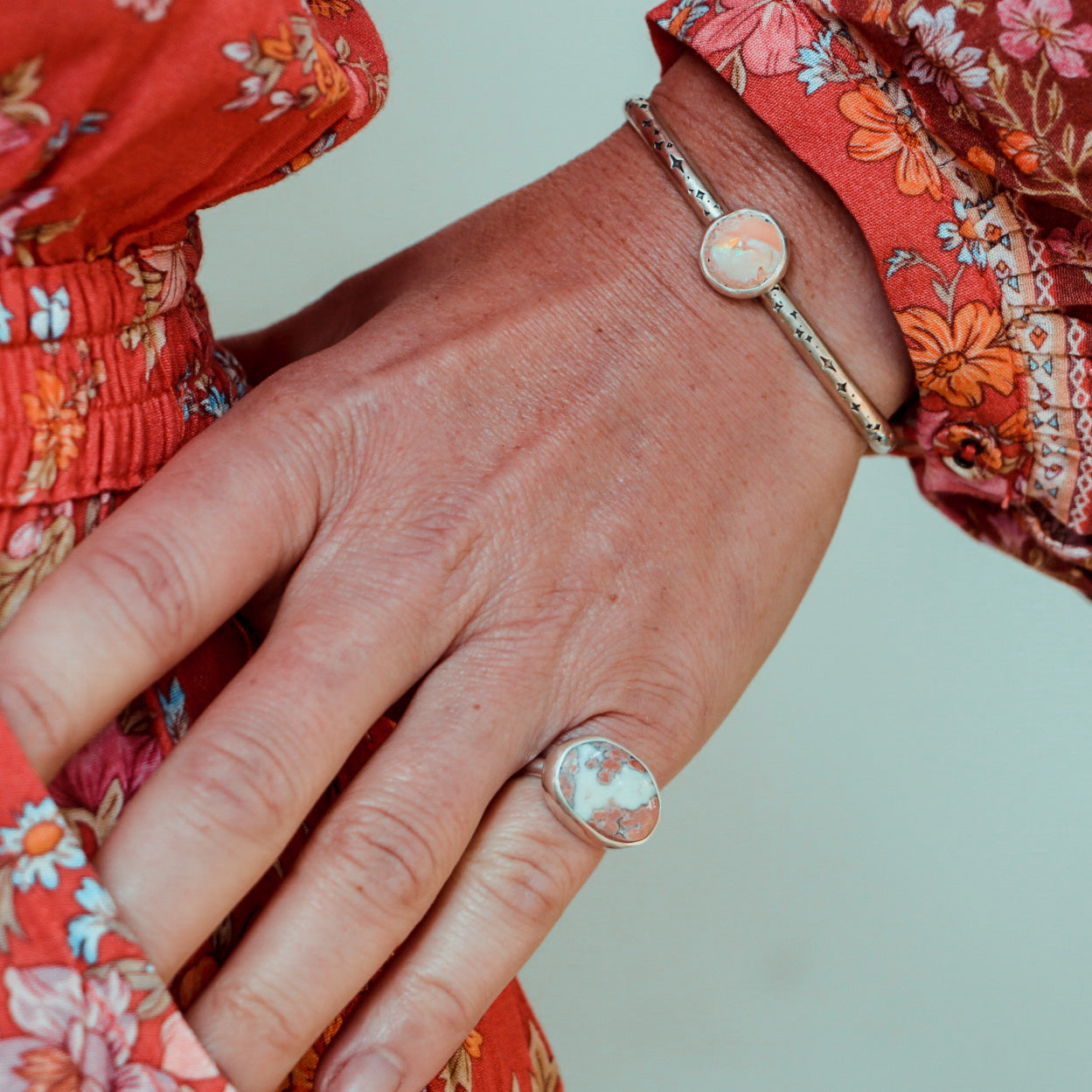 This one-of-a-kind cuff features a Mexican Opal with a sandy-peach matrix and bright flashes of rainbow opal fire.