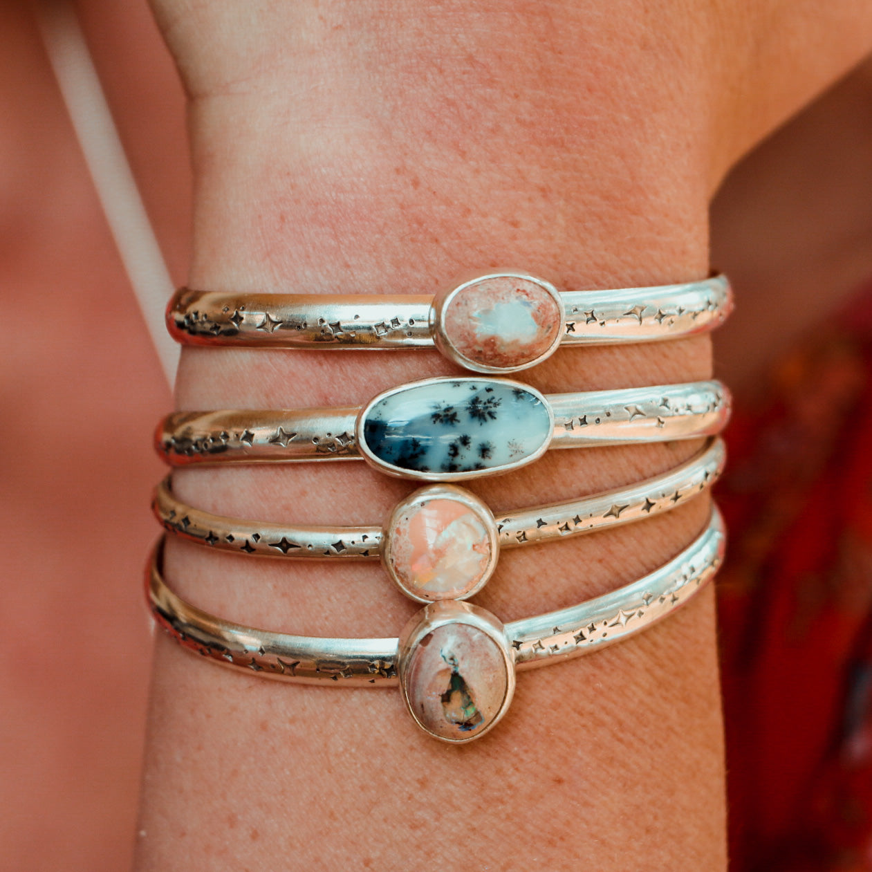 This cuff is made from sterling silver and fine silver, and features a hand-stamped band with a celestial pattern. The stone centerpiece measures 14mm wide by 11mm tall.